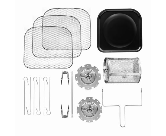 Вращающаяся корзина для картофеля фри, вертел для курицы-гриль с вилками для фиксации, вращающаяся подставка с шампурами, три решетки для запекания или сушки продуктов, поддон для сбора жидкости, металлический держатель, книга рецептов