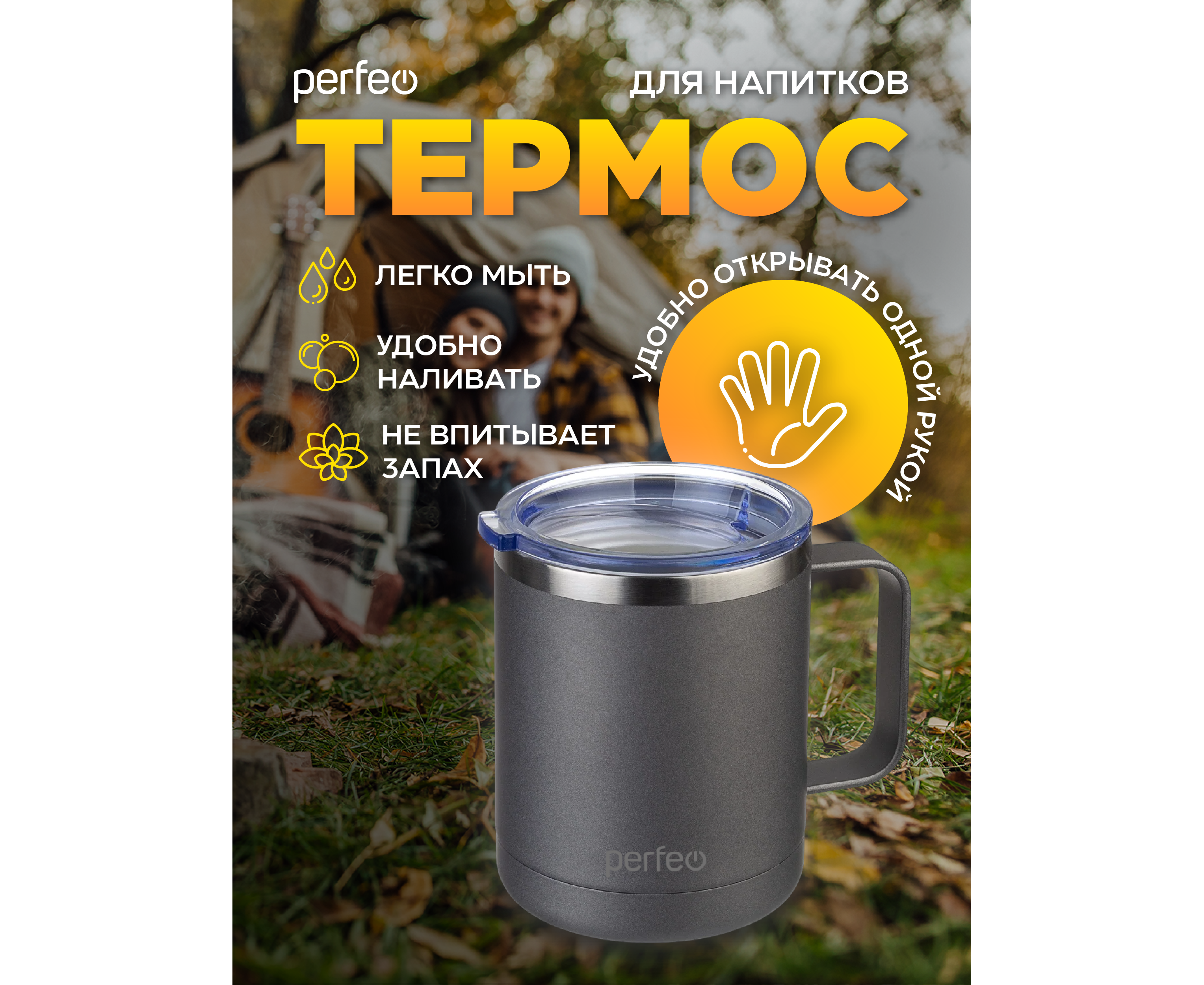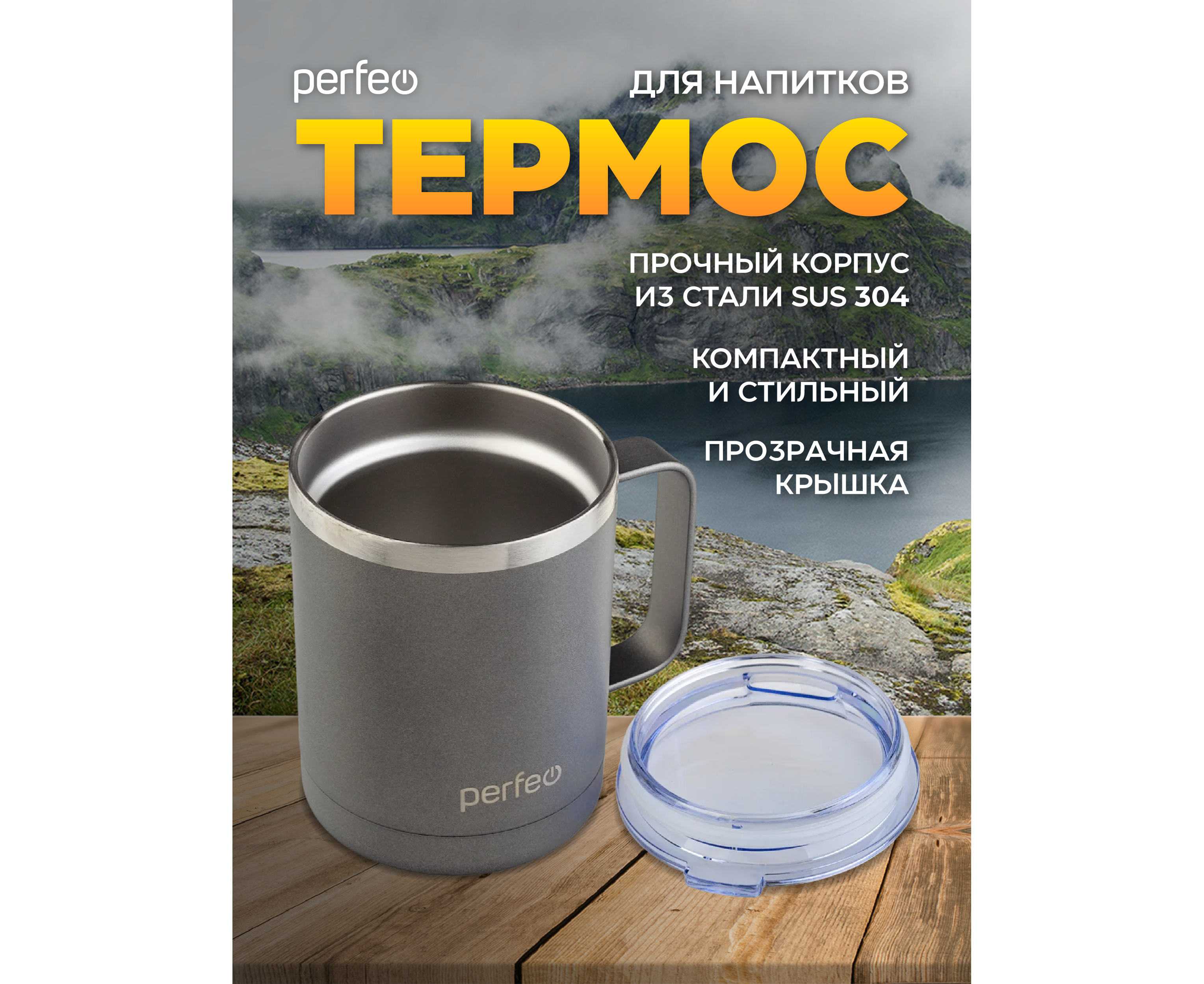 Акция !!! Термокружка для напитков PERFEO с прозрачной крышкой, ручкой, объем 0,35 л., серый (PF_C3731)