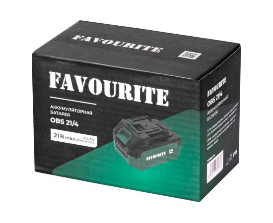 Батарея аккумуляторная Li-ion 21В, 4Ач, 1.1-1.3А One battery system FAVOURITE OBS 21/4 совместима с аккумуляторными инструментами системы One battery system. Литий-ионная аккумуляторная батарея характеризуется отсутствием эффекта памяти, что позволяет заряжать ее при любой степени разрядки. Имеет защиту от саморазряда и может продолжительное время храниться в заряженном состоянии.