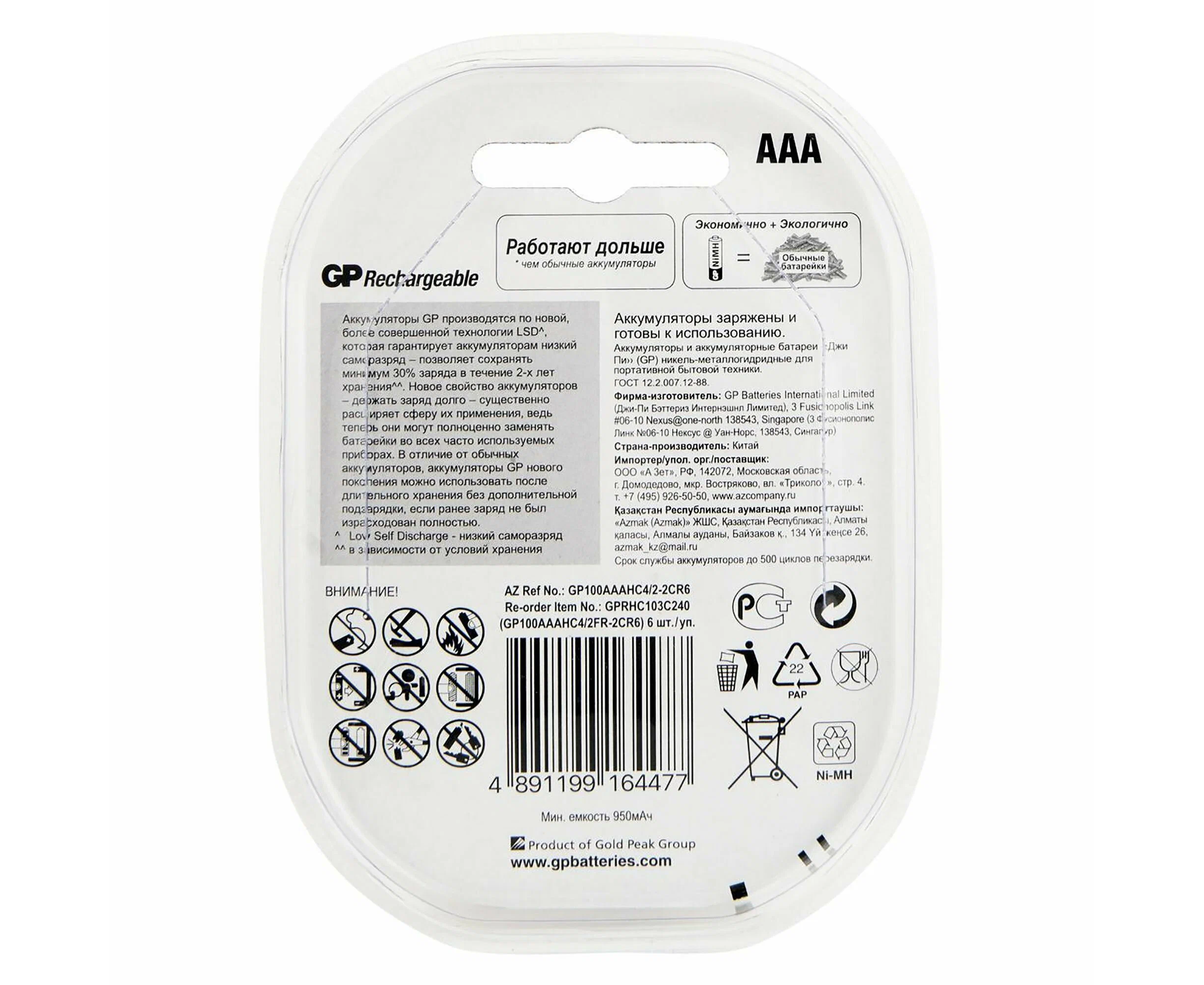 Аккумулятор GP Rechargeable 100AAAHC4 (100AAAHC4/2-2CR6 36/360) AAA, 1.2V 1 А·ч, 6 шт.
