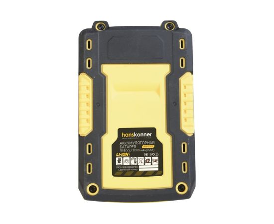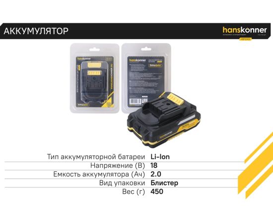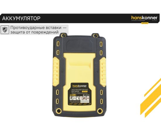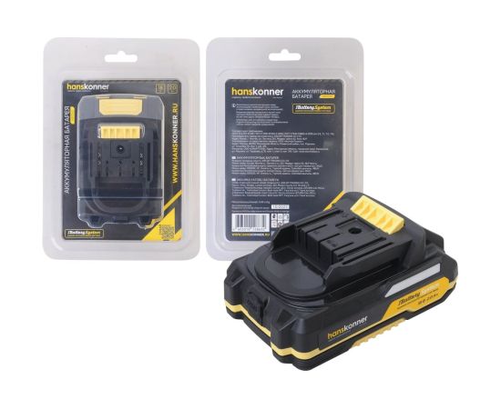 18-вольтовый аккумулятор Hanskonner HBP2002 емкостью 2.0 Ач обеспечивает впечатляющую мощность при минимальных размерах и совместим с любым инструментом единой аккумуляторной системы 1BatterySystem.