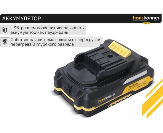 Аккумулятор Hanskonner HBP2002 18В, 1BatterySystem, 2.0Ач, USB-разъем