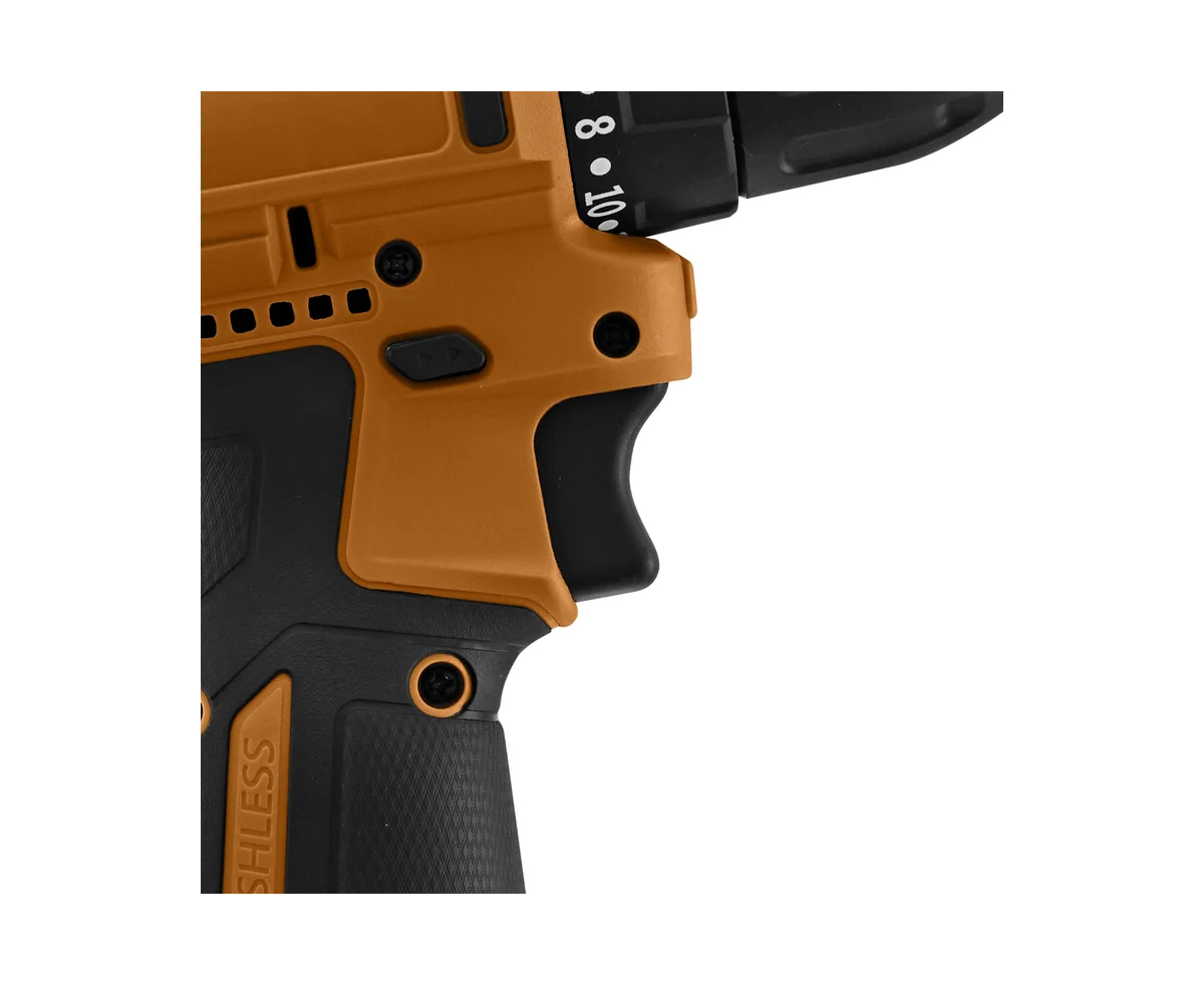 Дрель-шуруповерт КТ-6504 удобно лежит в руке. Устройство оснащено двумя скоростями работы и регулятором крутящего момента. Крутящий момент — это показатель, определяющий величину вращающего усилия. Чем он больше, тем в более твердые материалы можно вкрутить шуруп. Также на регуляторе крутящего момента отмечено положение, предназначенное для сверления отверстий.