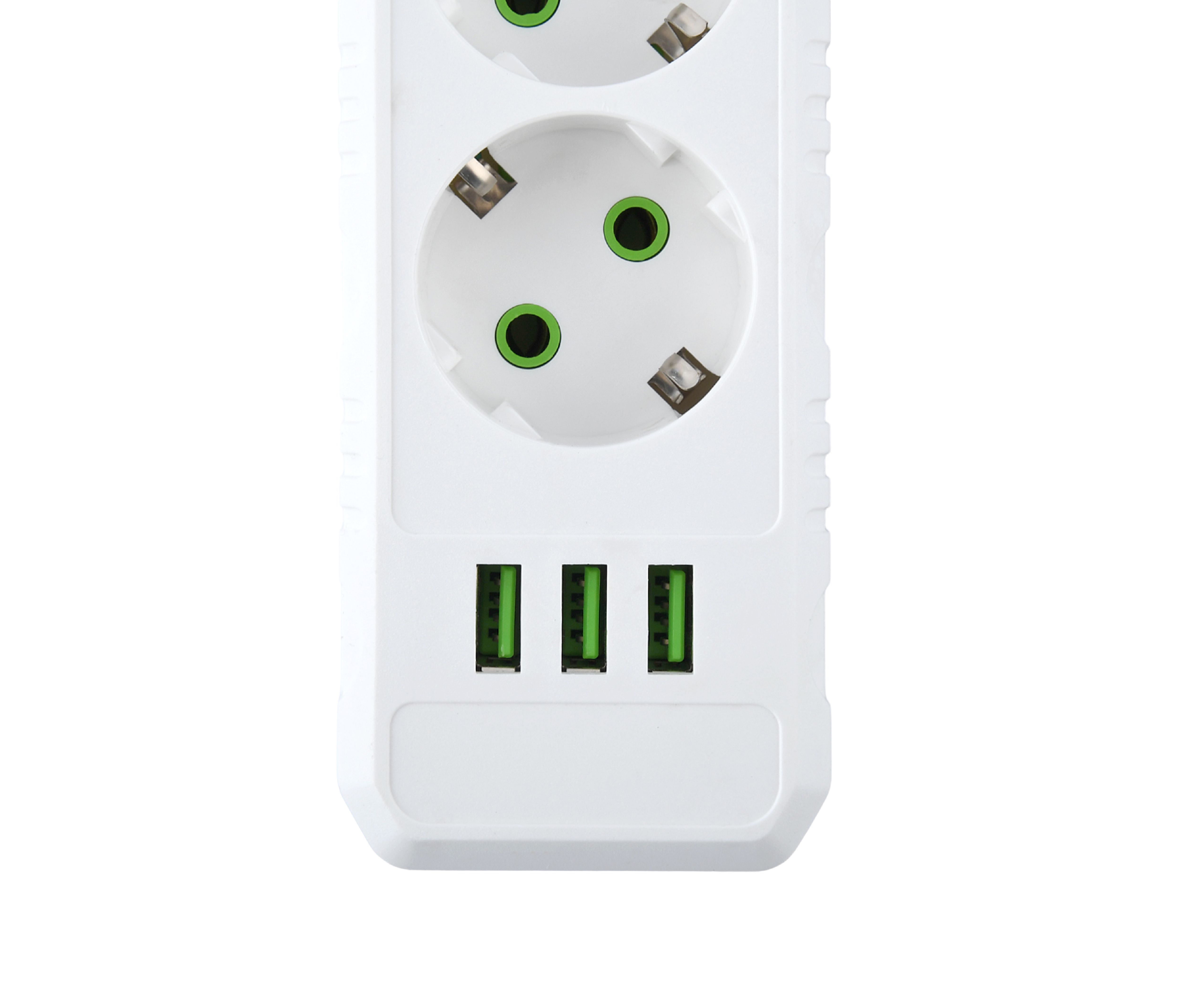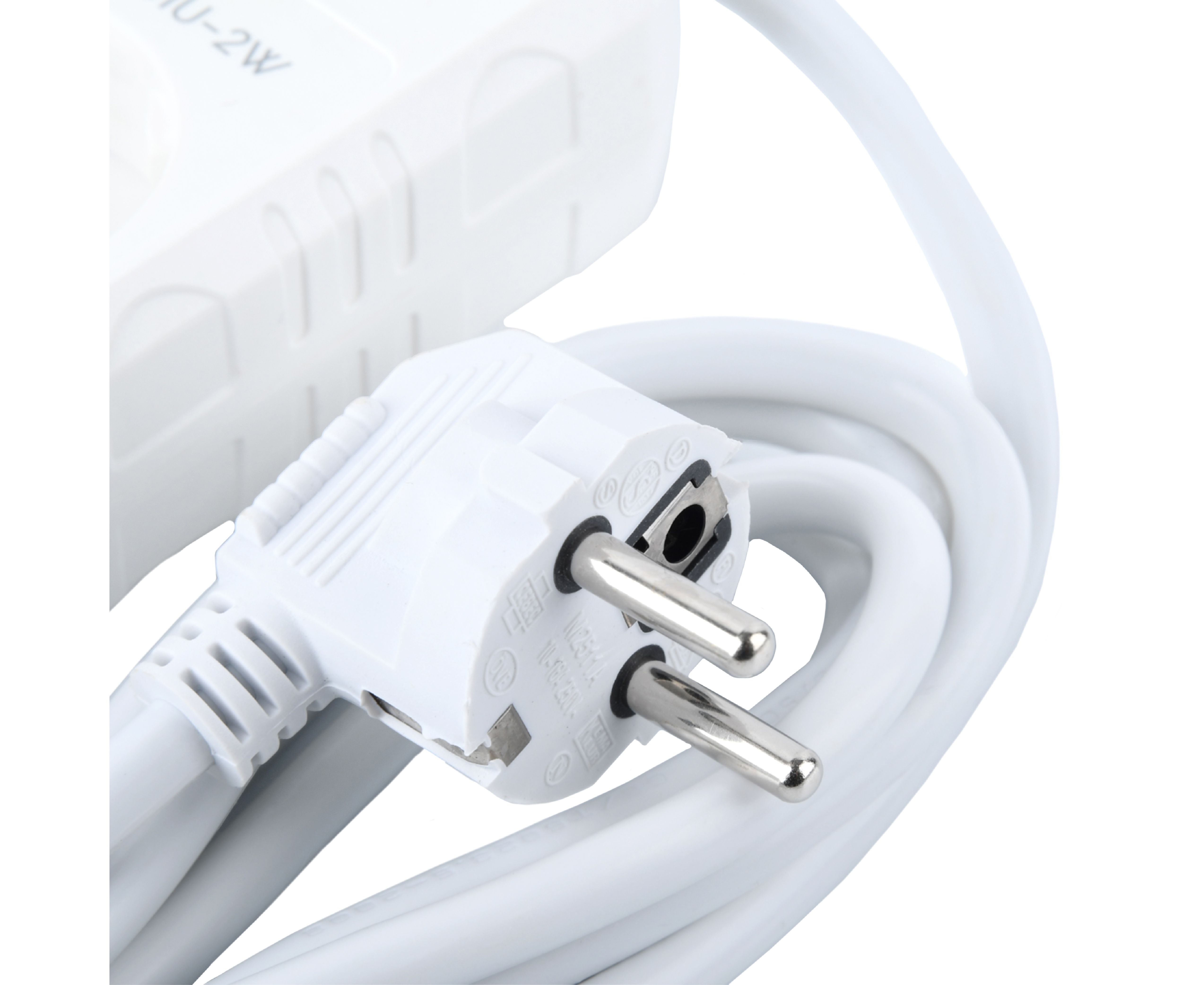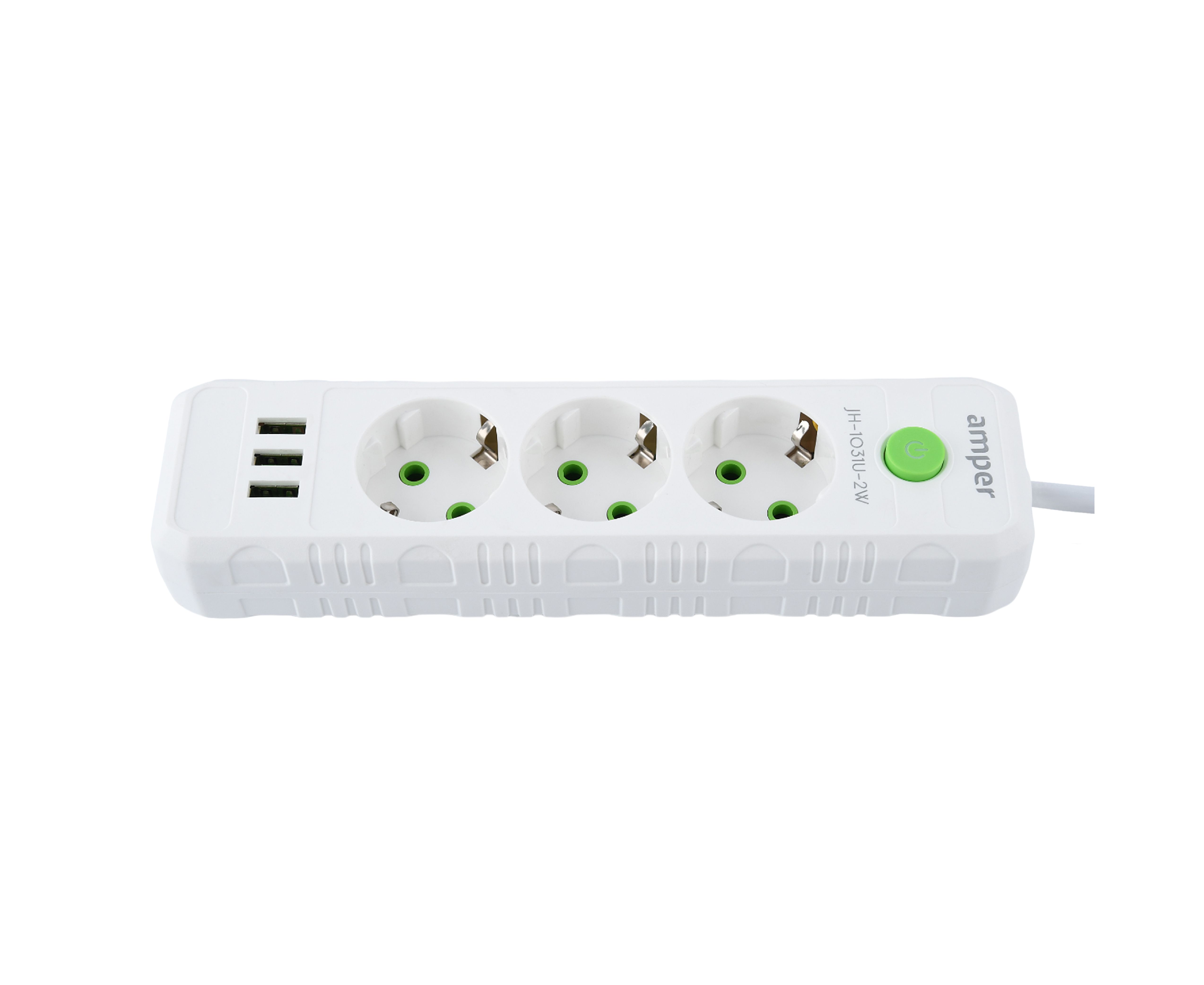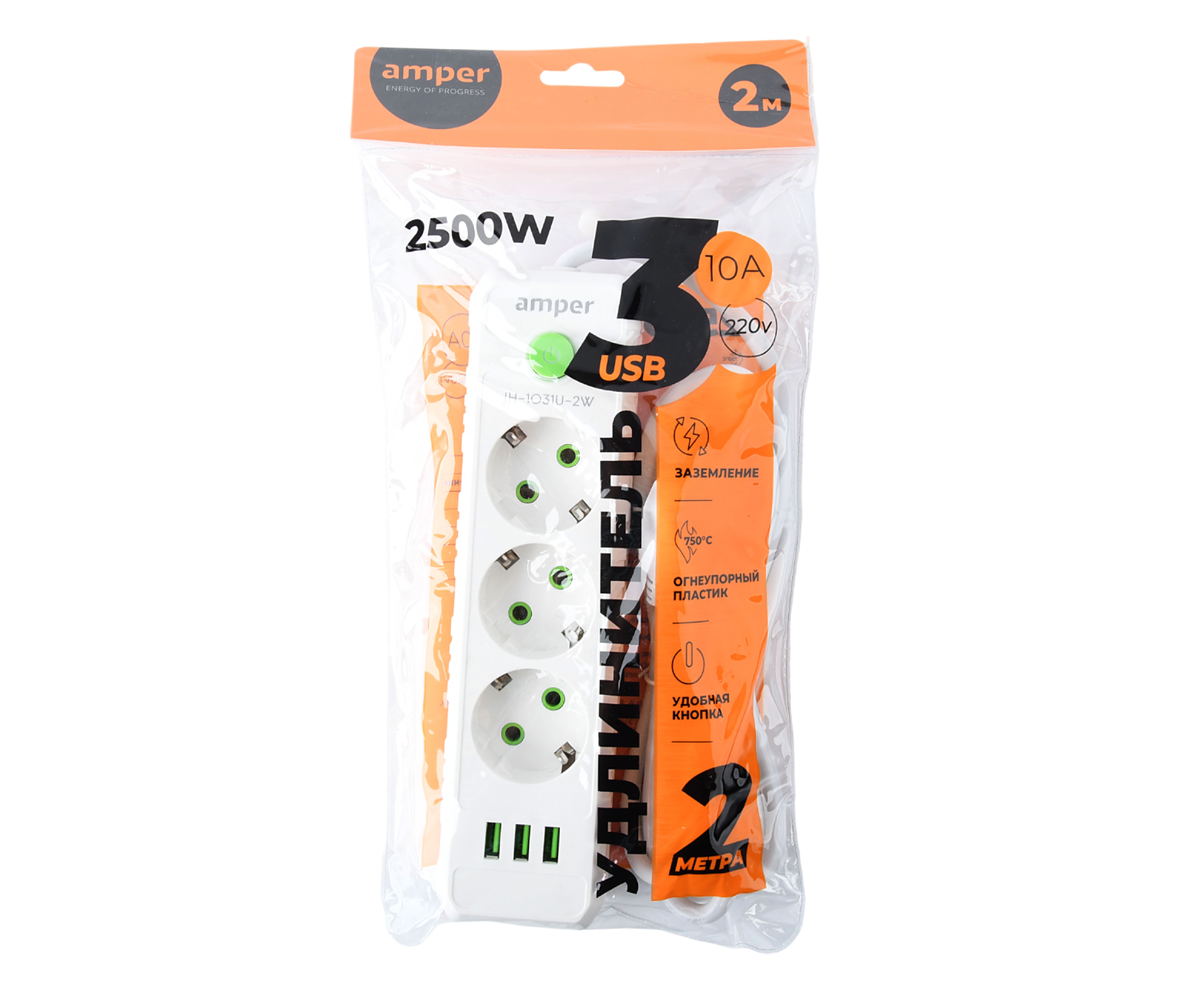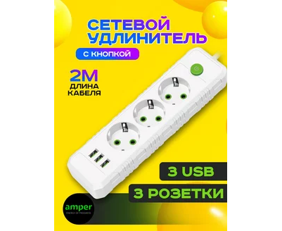 Сетевой удлинитель Amper , 2,0м, 3 розетки, 10А, 2500 Вт, 3usb, белый.