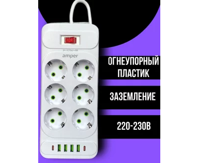 Сетевой удлинитель Amper 2,0м, 6 розеток, 10А, 2500 Вт, 4usb,2Type-C, белый