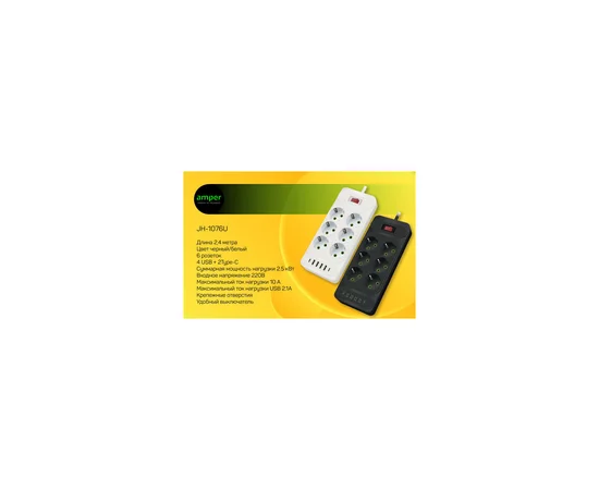 Сетевой удлинитель Amper 2,0м, 6 розеток, 10А, 2500 Вт, 4usb,2Type-C, черный