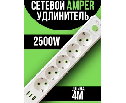 Сетевой удлинитель Amper , 4,0м, 5 розеток, 10А, 2500 Вт, 3usb, белый