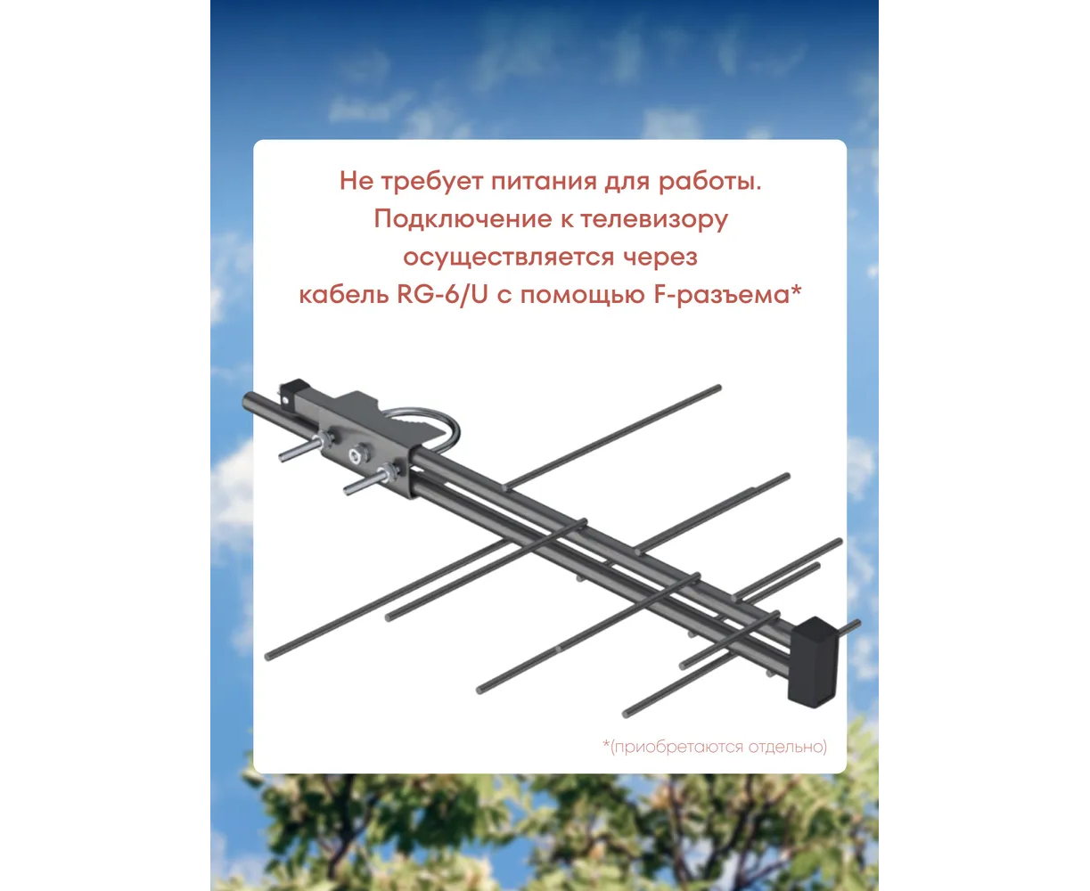 Антенна снабжена усилителем и блоком питания, но для подключения к телевизору дополнительно потребуются коаксиальный кабель, F-коннектор и штекер САТ-Ш, которые не в комплект не включены. Также рекомендуем обратить внимание на акссесуары для ТВ-систем, такие как кронштейны, мачты и делители сигнала на несколько телевизоров.
