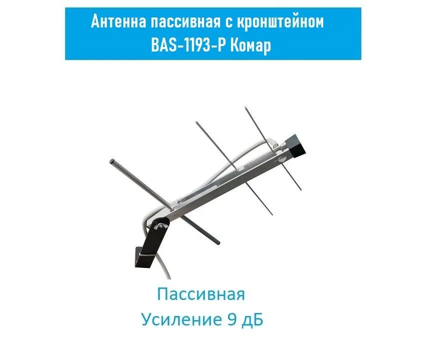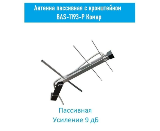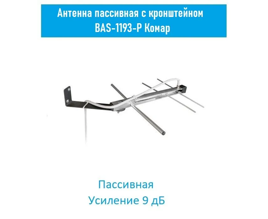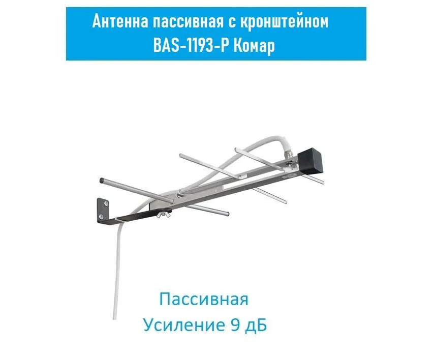 Недорогая пассивная антенна «BAS-1193-P Комар» наружного размещения применяется в условиях удовлетворительного приема ТВ сигнала. Она имеет легкую и долговечную алюминиевую конструкцию. Проста в сборке и установке. Вы можете установить ее на настенный кронштейн из комплекта поставки. Конструкция позволяет поворачивать антенну на кронштейне на любой угол в горизонтальной плоскости. Антенна подключается к телевизору через кабель RG-6/U или аналогичный с помощью F-разъема (приобретается отдельно). Антенна пассивная и не требует подачи питания для работы. Специально разработанная конструкция позволяет использовать антенну в суровых климатических условиях.