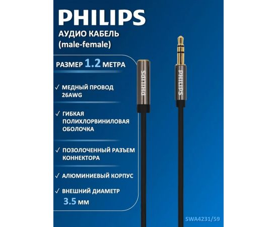 Аудио кабель Philips SWA4231/59, 3.5 мм, (male-female), серый, 1.2 м для передачи звука с одного устройства на другое. С помощью разъема aux вы сможете подключить акустическую систему, наушники или колонки к компьютеру, тв, смартфону или планшету и получить желаемый звук. Достаточная длина прочного кабеля 1,2 метра позволит подключиться к аудиоразъему на системном блоке компьютера или просматривать телевизор в наушниках. Высокое качество коннекторов - проводник из бескислородной меди высокой очистки для наилучшего качества передачи сигнала.