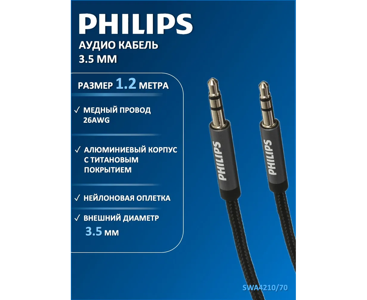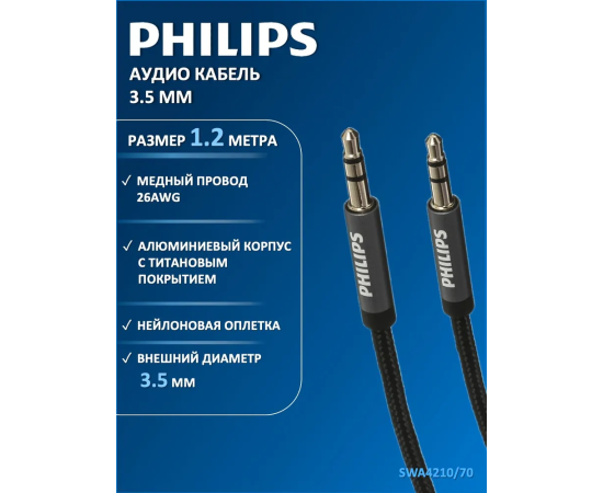 Аудио кабель Philips SWA4210/70, 3.5 мм, в оплетке, серый, 1.2 м для передачи звука между устройствами с выходом mini jack 3.5. Акустический кабель подходит для смартфонов, планшетов, iPod, iPhone, Samsung, наушников, портативных колонок, автомобильной аудиосистемы и музыкальных центров. Аудио-кабель JACK M - JACK M оптимальной длины 1.2 метра в мягкой нейлоновой оплетке и высоким качеством коннекторов, отлично подходит для различных температурных режимов и остается гибким и прочным во всевозможных условиях и ситуациях. Проводник из бескислородной меди высокой очистки для наилучшего качества передачи сигнала.