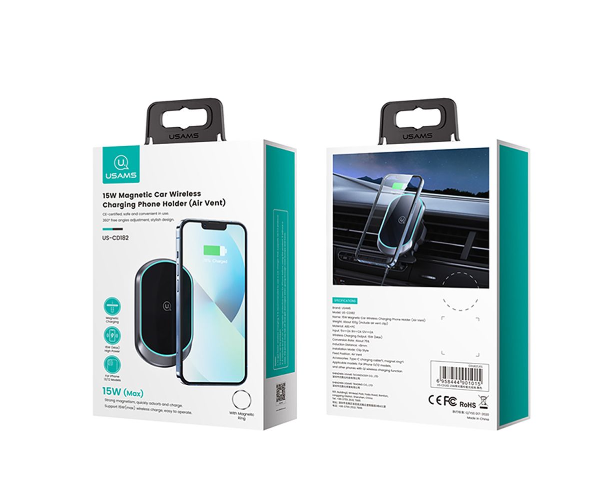 Автодержатель Usams US-CD182 магнитный, на воздуховод, для смартфона, QC3.0, чёрный