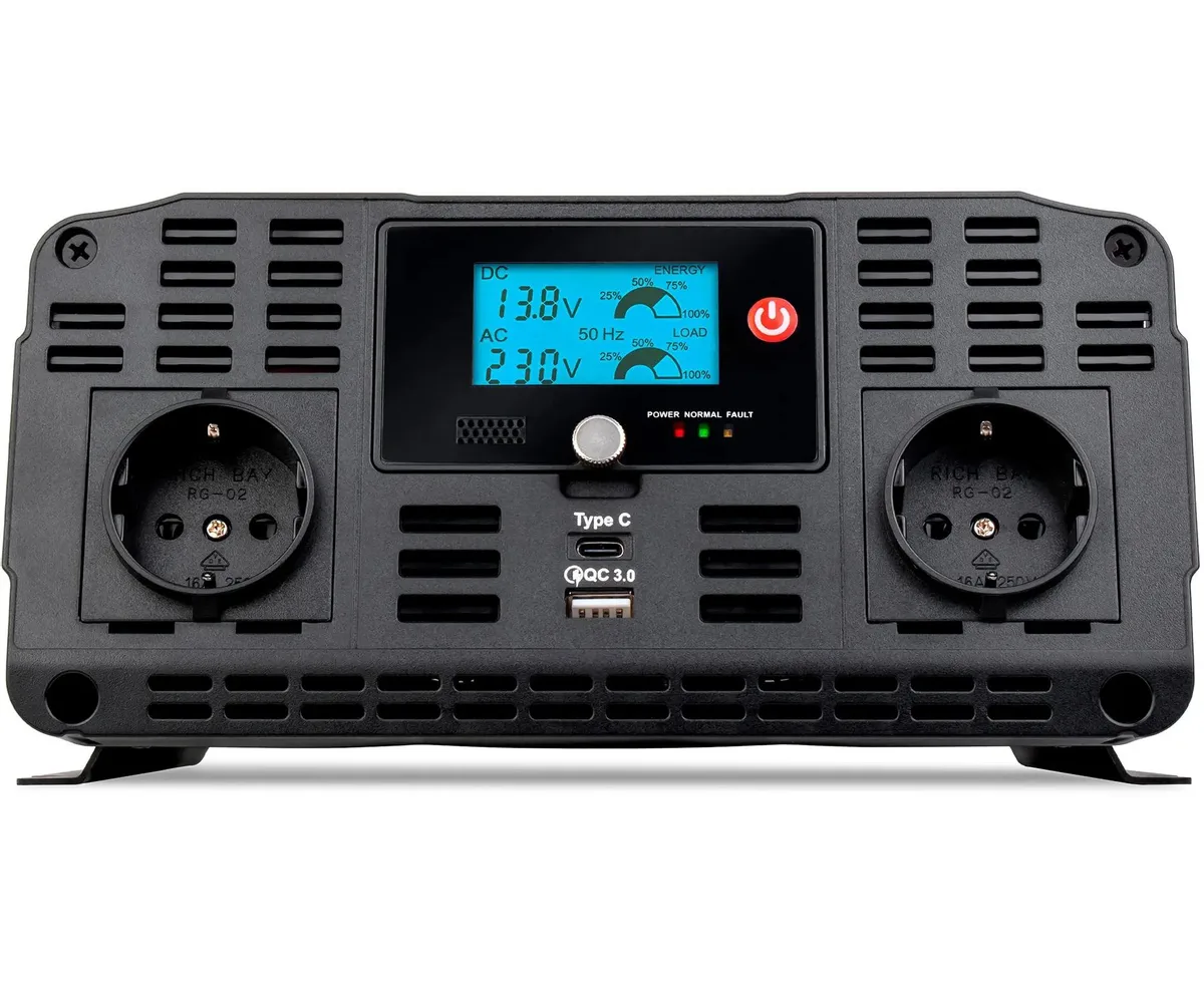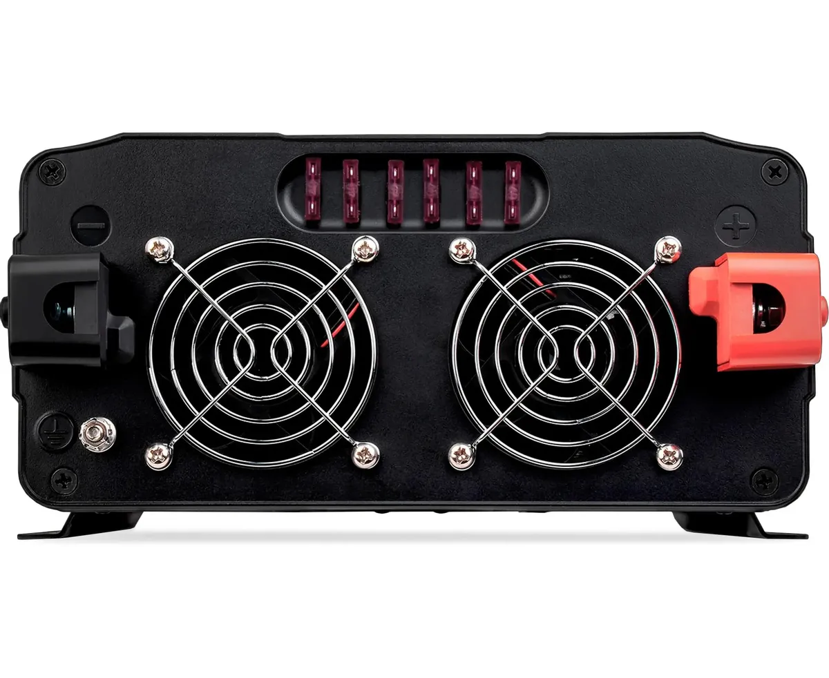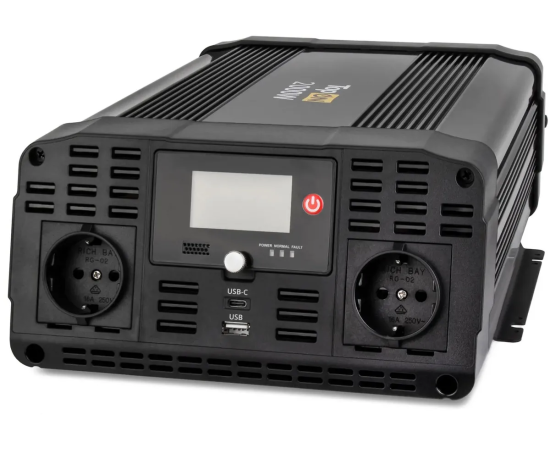 Чистая синусоида (PSW), порты Type-C и USB с QC, корпус ABS, LCD-экран, активное охлаждение, отслеживание ёмкости аккумулятора, медные контакты с огнестойкой оболочкой, крепления для фиксации инвертора, 6 предохранителей 40A, контакт заземления, звуковое предупреждение, система электрических защит