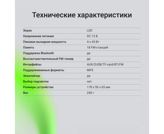 Вендор DIGMA Основные характеристики Мощность 4x45Вт Типоразмер 1 din Модуль Bluetooth ДА Поддержка носителей USB-порт1 Тип карт памяти SD/MMC Разъемы, интерфейсы Аудиовход на передней панели ДА