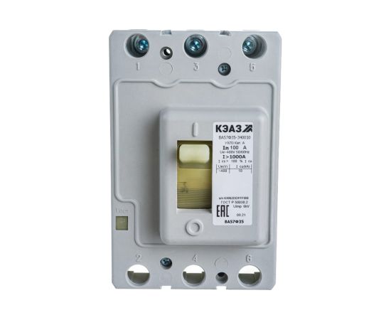 Автоматический выключатель КЭАЗ ВА57Ф35-340010-100А-1000-400AC-УХЛ3-КЭАЗ 109286 - трехполюсный коммутационный аппарат в литом корпусе. Предназначен для проведения тока по электроцепи в нормальном режиме и защиты различного оборудования от перегрузок и короткого замыкания.