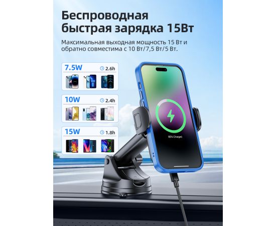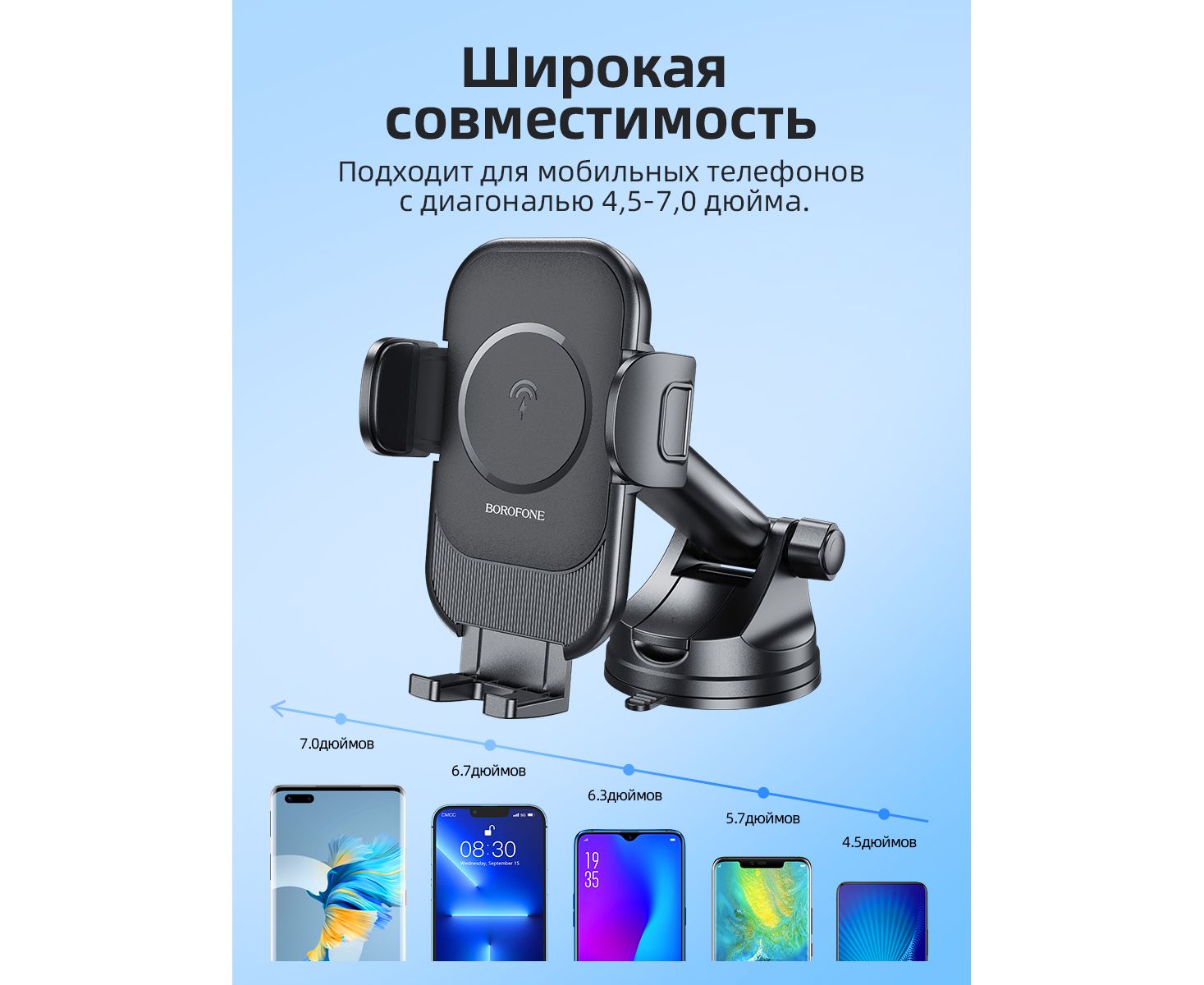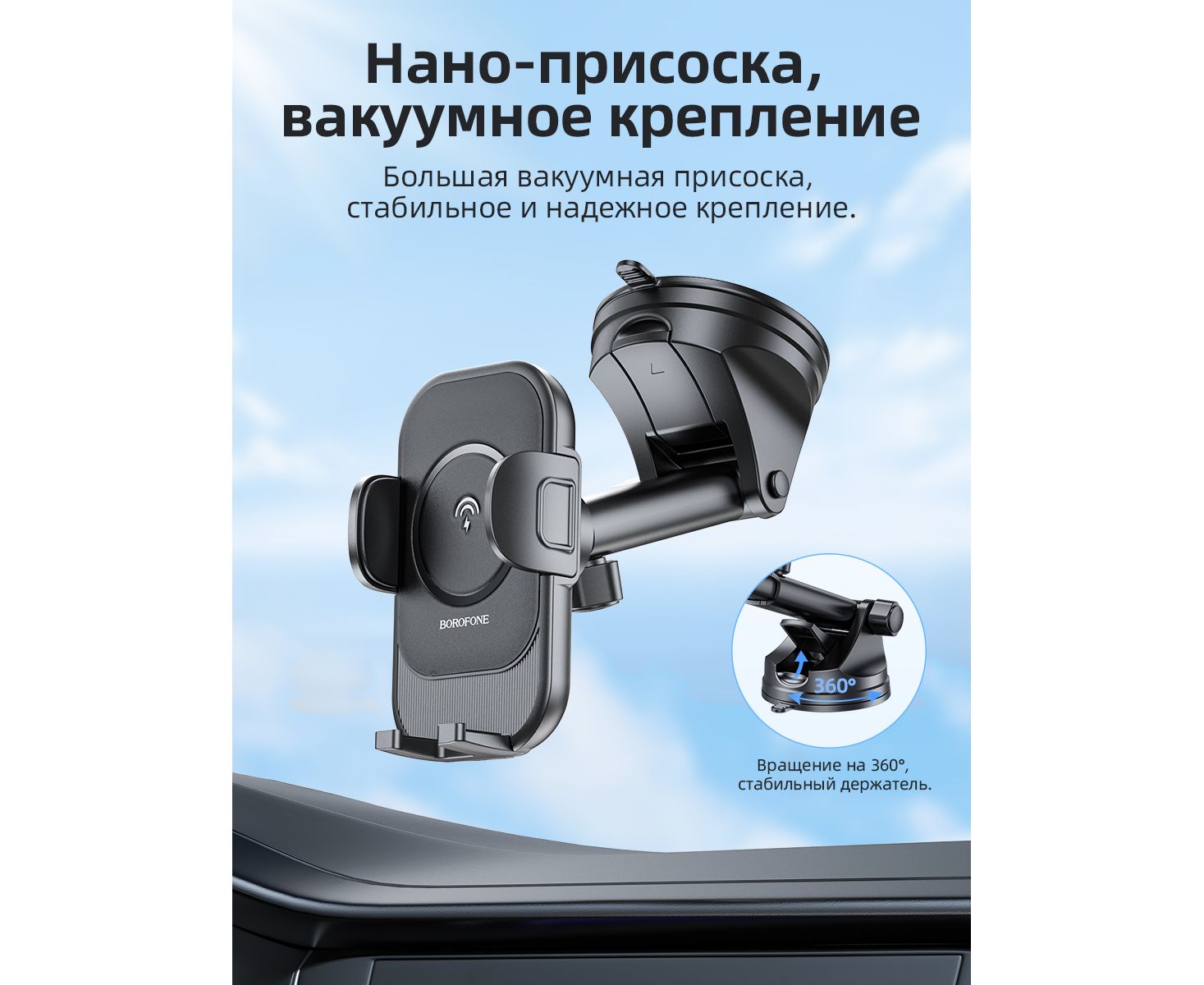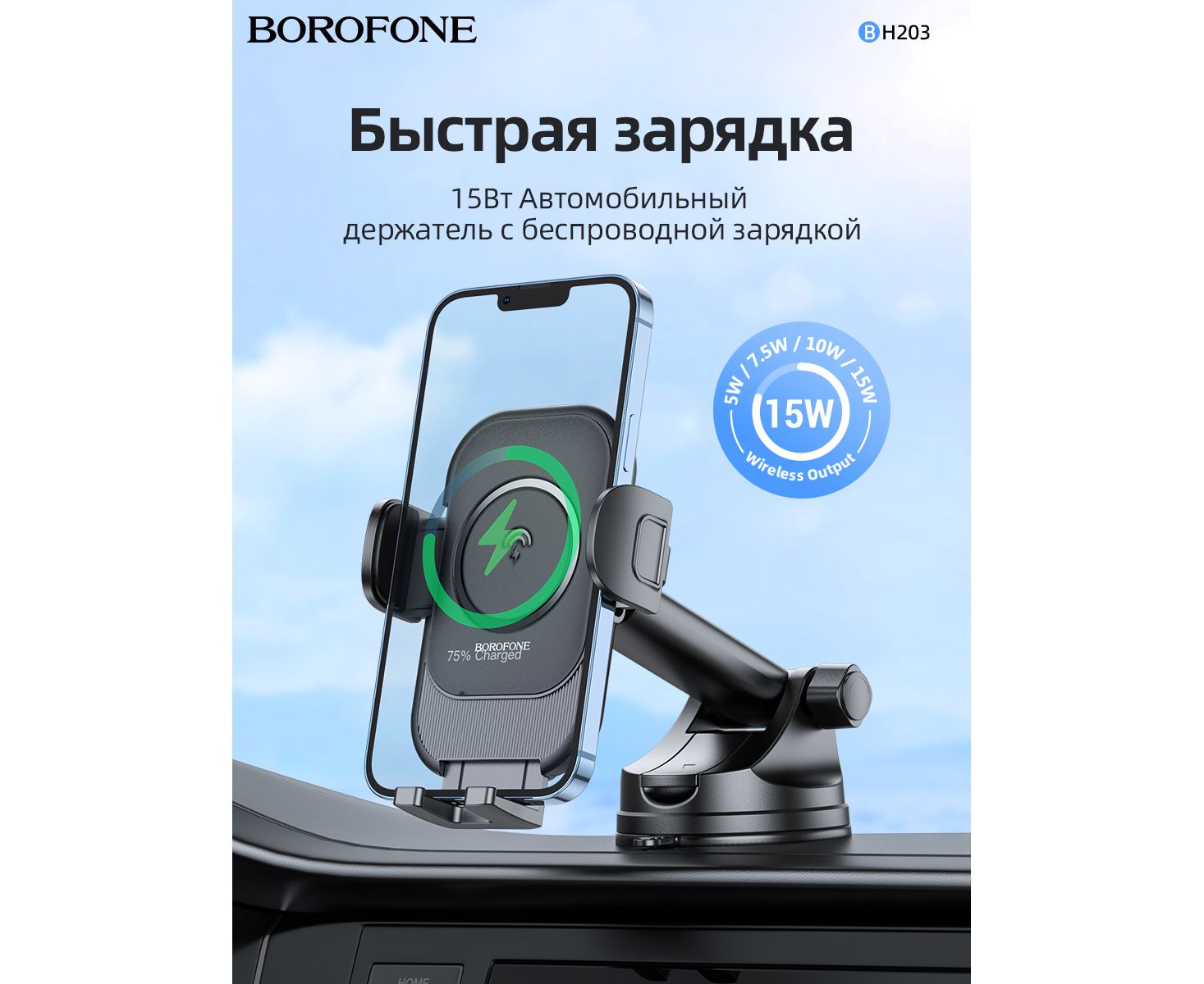 Автомобильный держатель BOROFONE BH203 Blue Charm wireless fast charging (center console) (черный) (акция)