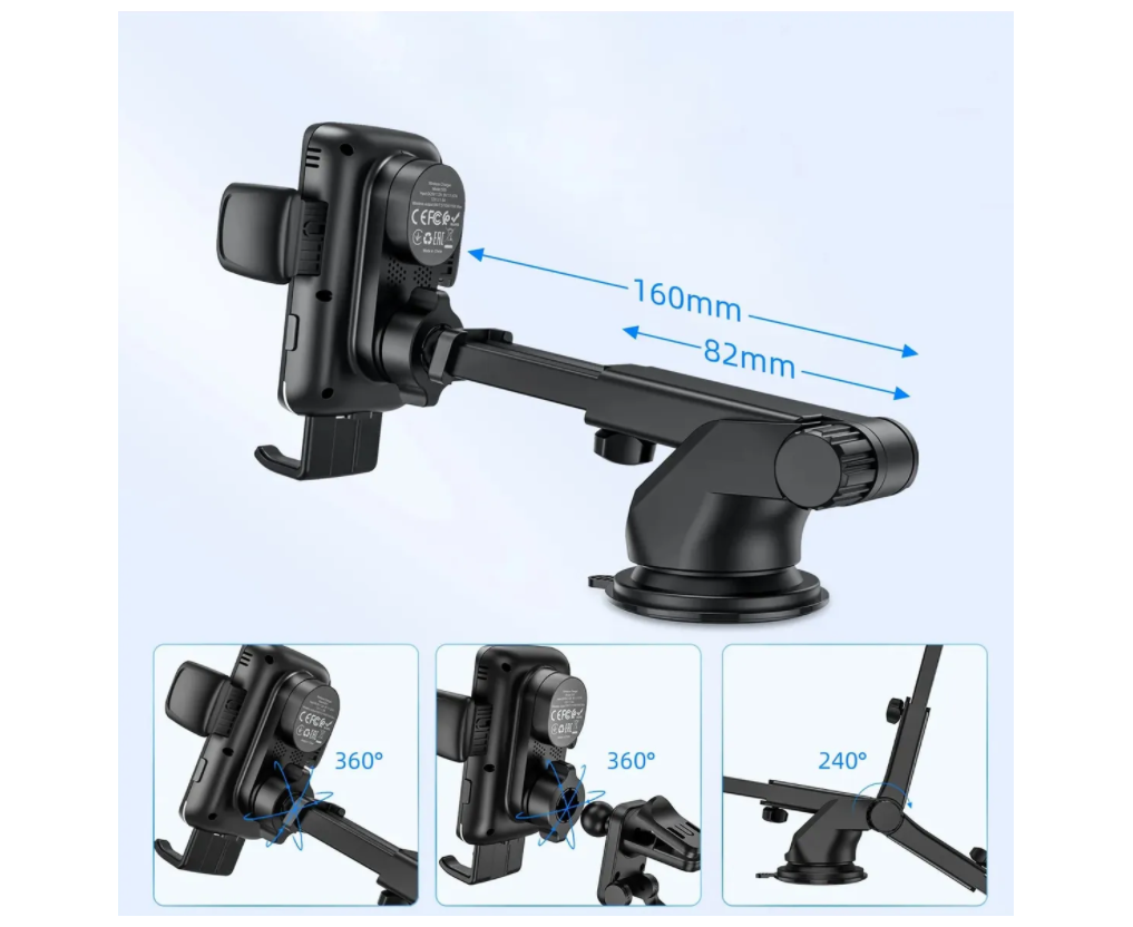 зажим, кронштейн, липкая основа, присоска, Быстрая зарядка 15 Ватт позволяет с умом, На вакуумной присоске,подвижный (поворотно-наклонный),прищепка