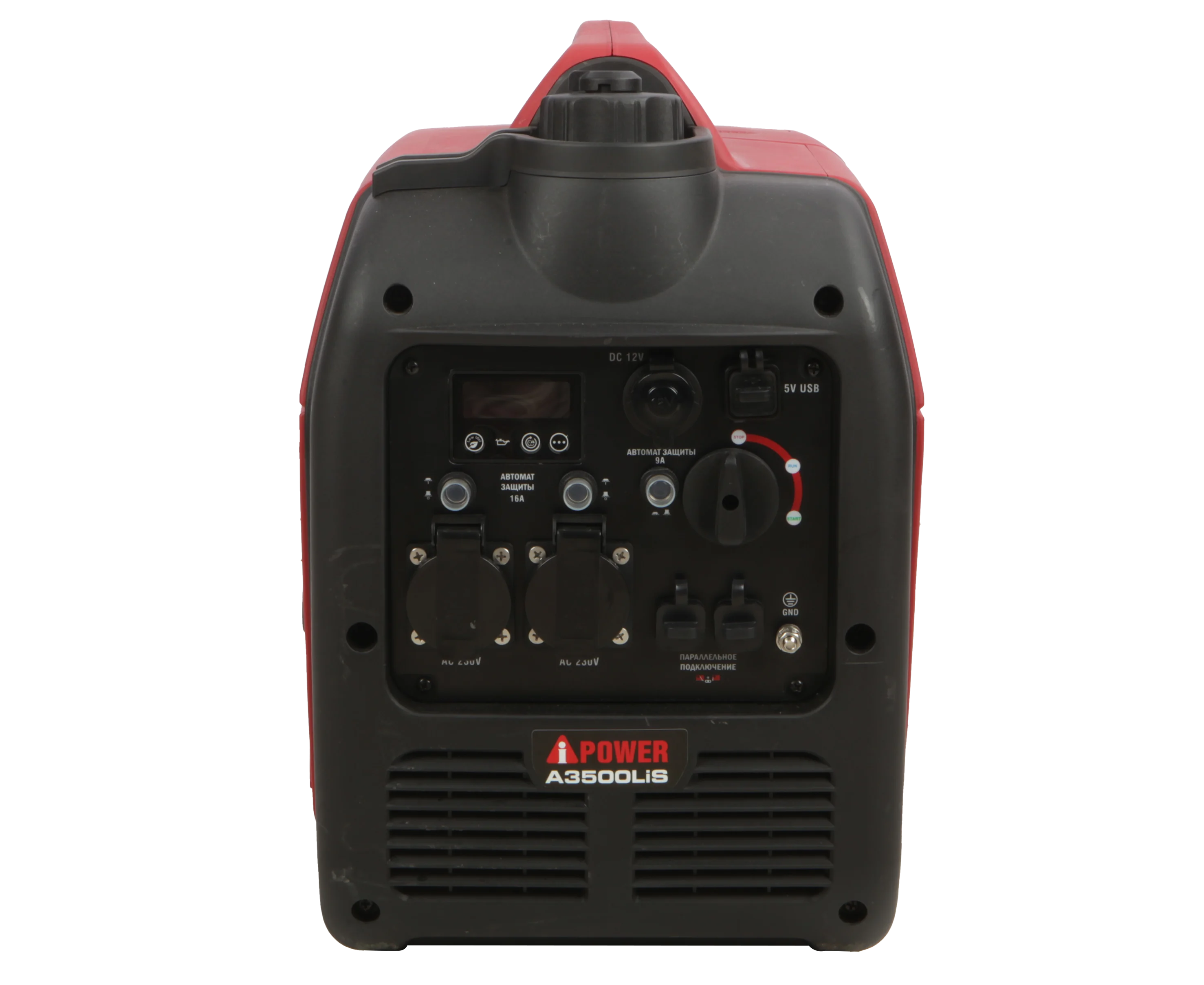 На панели управления генератора выведены 2 стандартные розетки 230В, одна розетка под прикуриватель 12В и USB выход, выходы для параллельной эксплуатации. Многофункциональный дисплей отображает основные параметры работы генератора. Все розетки имеют защиту от влаги и пыли.