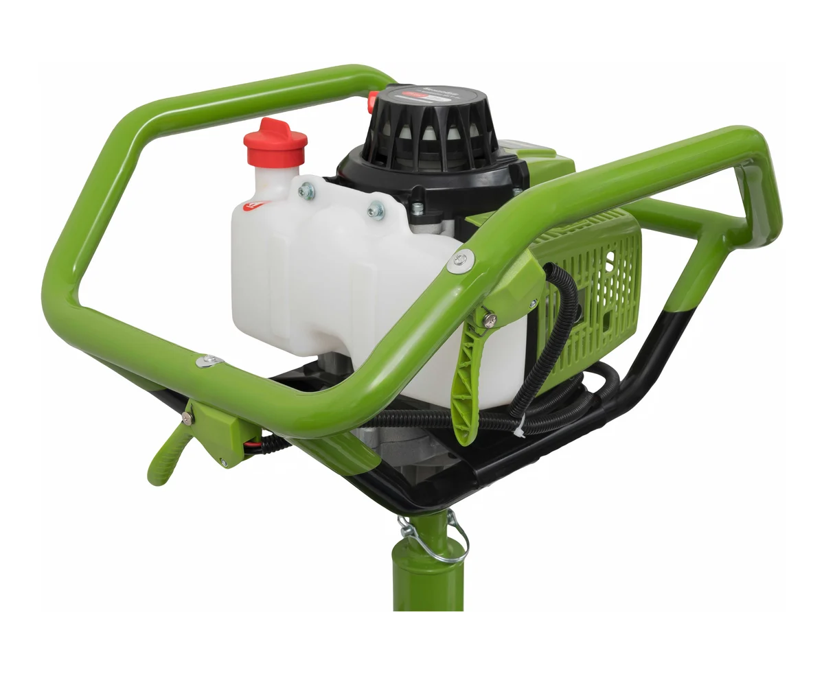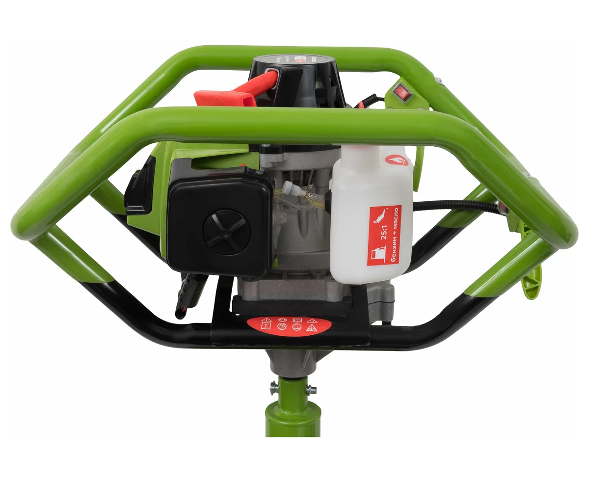 Максимальный диаметр бура составляет 300 мм, что делает его подходящим для различных задач. Устройство оснащено 2-тактным двигателем, который развивает до 8800 оборотов в минуту, обеспечивая стабильную работу. Емкость топливного бака в 1,6 литров позволяет длительное время работать без дозаправки. В комплект входит шнек, что упрощает подготовку к работе.