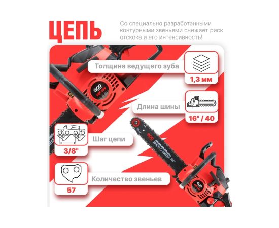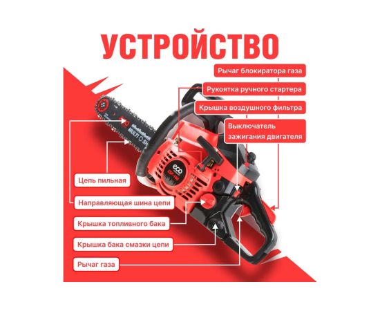 Удобно расположенные топливный насос (праймер) и винт натяжения цепи; хорошо сбалансированная конструкция; полноценный комплекс безопасности – инерционный тормоз, уловитель цепи, защита от случайного включения; антивибрационная система; автоматическая подача масла на трущиеся элементы пильной части.