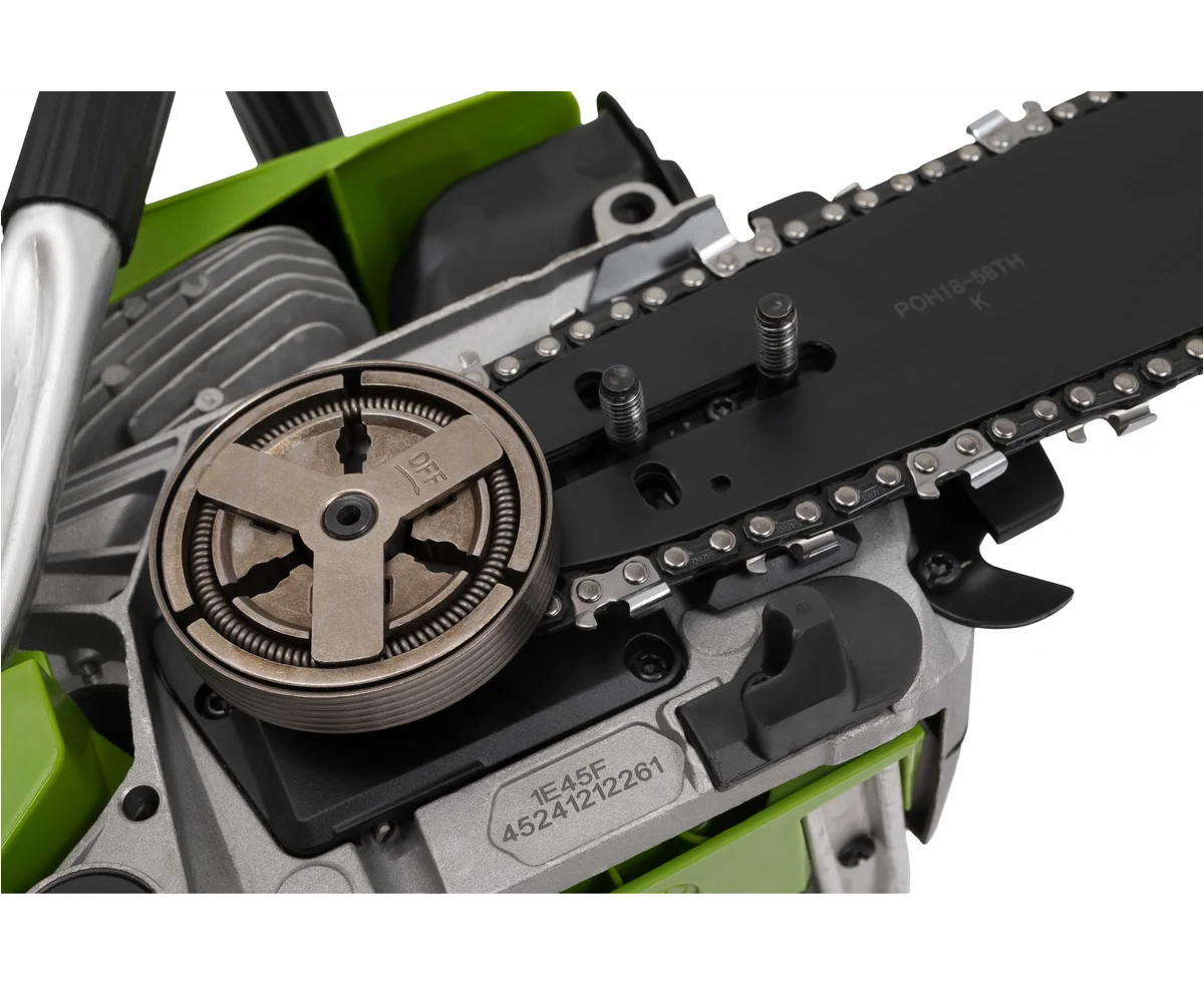 Двухтактный двигатель гарантирует стабильную работу, а длина шины в 45 см позволяет легко справляться с крупными деревьями. Пила оснащена системой легкого запуска и праймером, что упрощает процесс запуска даже в холодную погоду. Максимальная скорость вращения цепи достигает 21 м/с, что способствует быстрому и точному распилу.