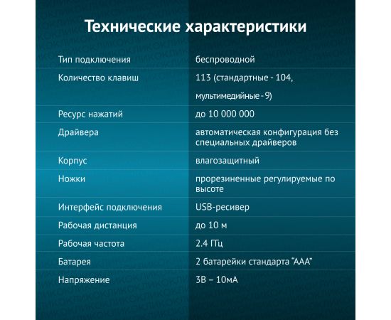 Особенности - Беспроводная клавиатура с продуманной эргономичной конструкцией для работы дома и в офисе. Девайс оборудован регулируемыми по высоте ножками. Дополнительные мультимедийные и офисные клавиши обеспячат быстрый доступ и управление нужными приложениями.