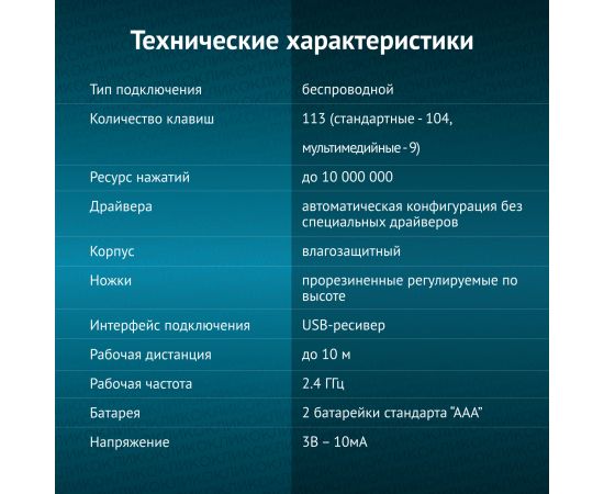 Особенности - Беспроводная клавиатура с продуманной эргономичной конструкцией для работы дома и в офисе. Девайс оборудован регулируемыми по высоте ножками. Дополнительные мультимедийные и офисные клавиши обеспячат быстрый доступ и управление нужными приложениями.