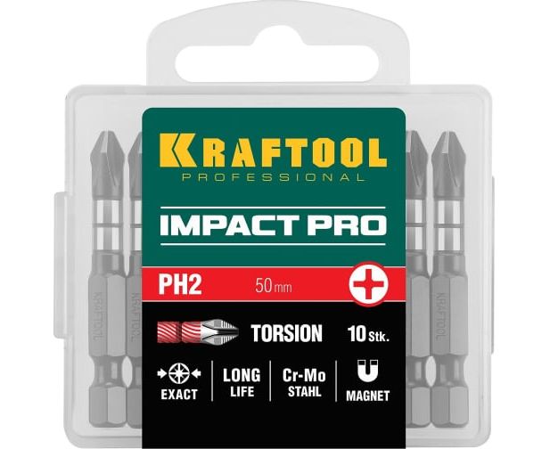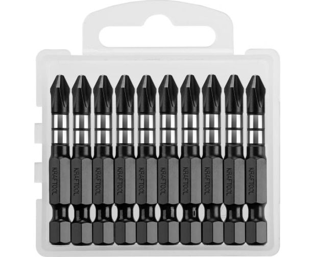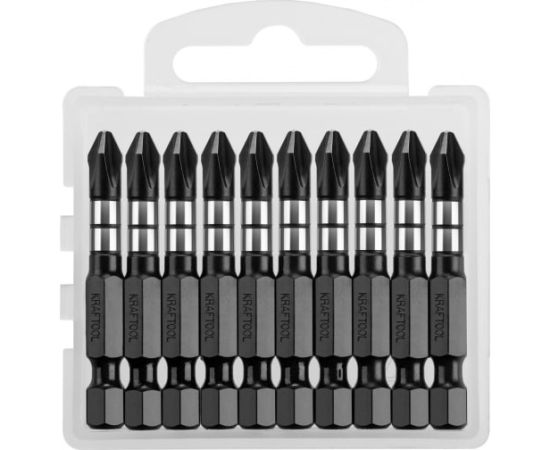 Биты KRAFTOOL 26191-2-50-S10 Impact Pro, Philips, тип хвостовика E 1/4", PH2, 50мм, 10шт, в пластиковом боксе