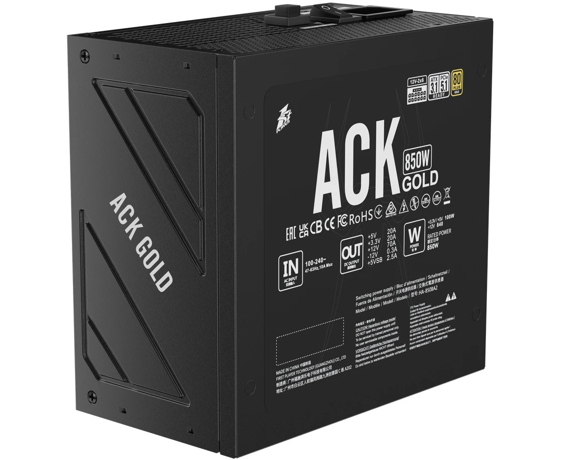 Блок питания 1STPLAYER ACK Gold 850W Black (HA-850BA2-BK) / ATX 3.1, PCle 5.1, APFC, 80 Plus Gold, LLC+DC-DC, full Teapo caps, 140mm fan, full modular
