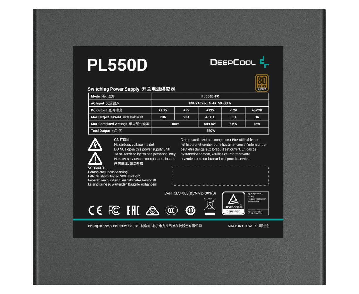 Блок питания Deepcool PL550D (ATX 3.0, 550W, PWM 120mm fan, Active PFC+DC to DC, 80+ Bronze) RET