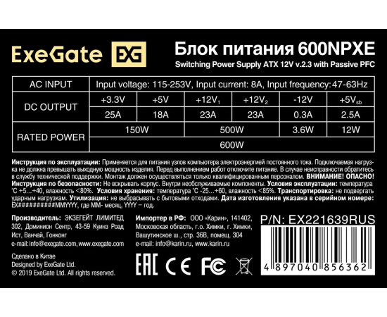Блок питания ExeGate 600NPXE EX221639RUS-PC 600W (ATX, PPFC, PC, 12cm fan, 24pin, 2x(4+4)pin, 2xPCI-E, 5xSATA, 3xIDE, black)