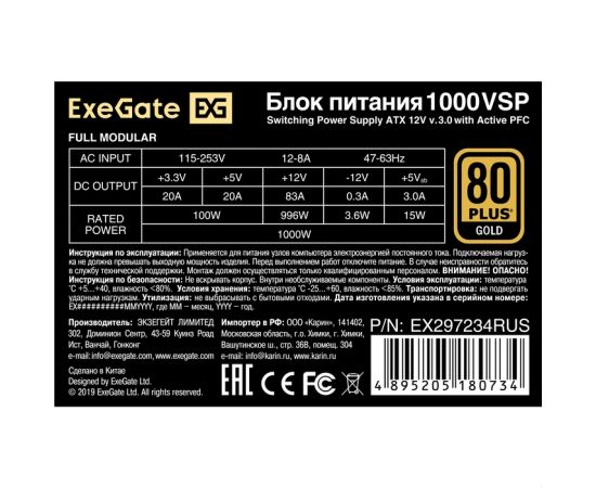 Блок питания Exegate 80 Plus Gold 1000VSP FC EX297234RUS 1000W(ATX3.0, APFC, КПД 90пр (80 Plus Gold), 120mm fan, 24pin, 2x(4+4)pin