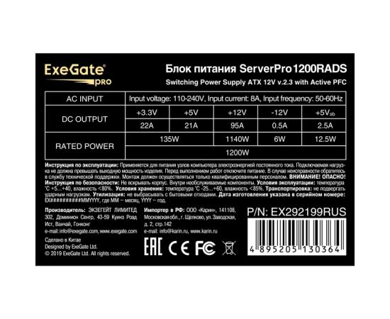 Блок питания ExeGate ServerPRO-1200RADS EX292199RUS 1200W (ATX, for 3U+ cases, КПД 82% (80 PLUS), 14cm fan
