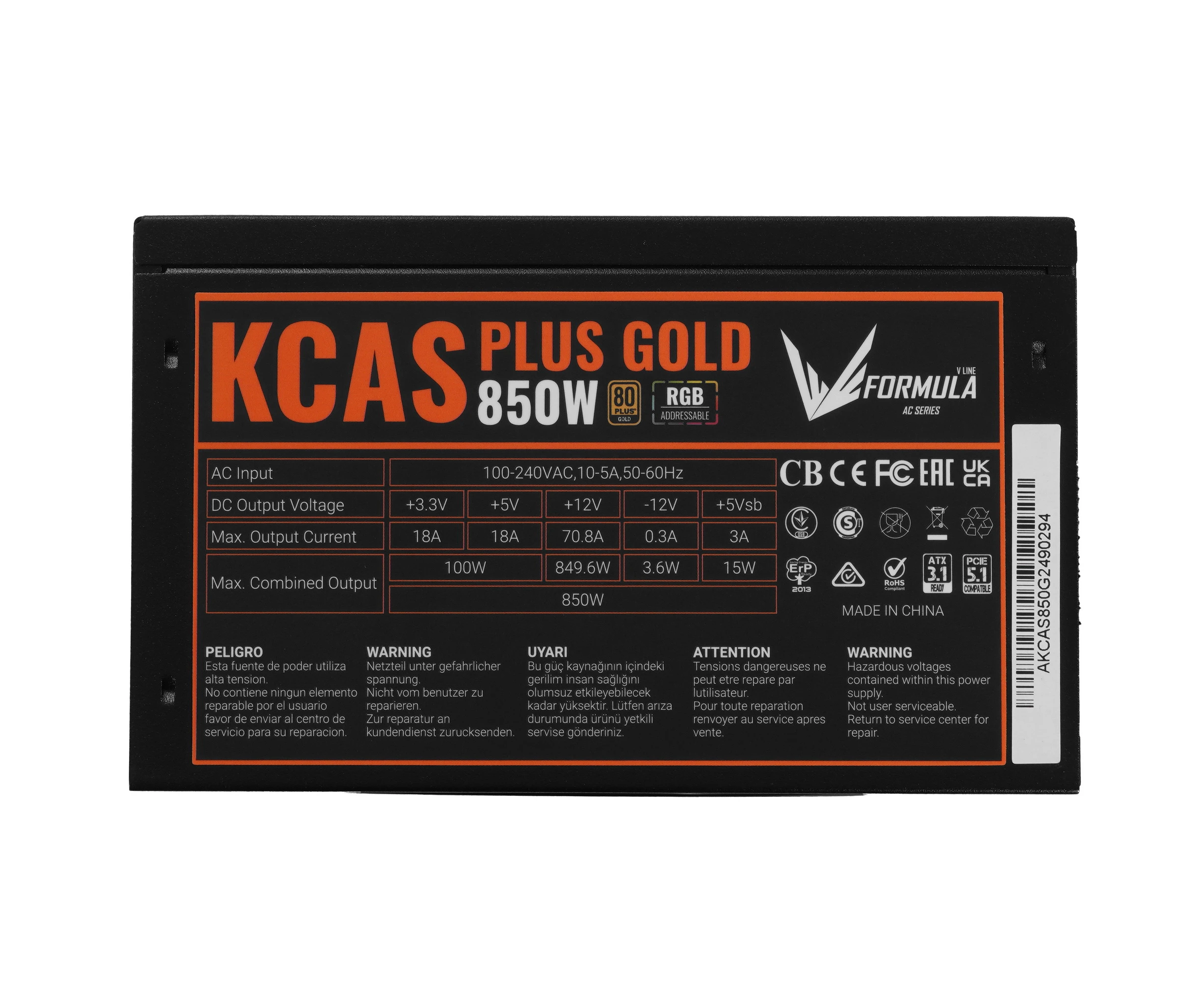 Блок питания Formula V Line KCAS Plus Gold 850W RGB, 850W, ATX3.1/PCIe5.1, APFC, 80+ Gold, 12cm Fan