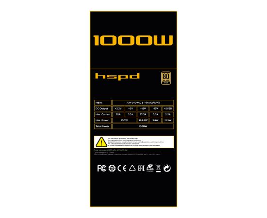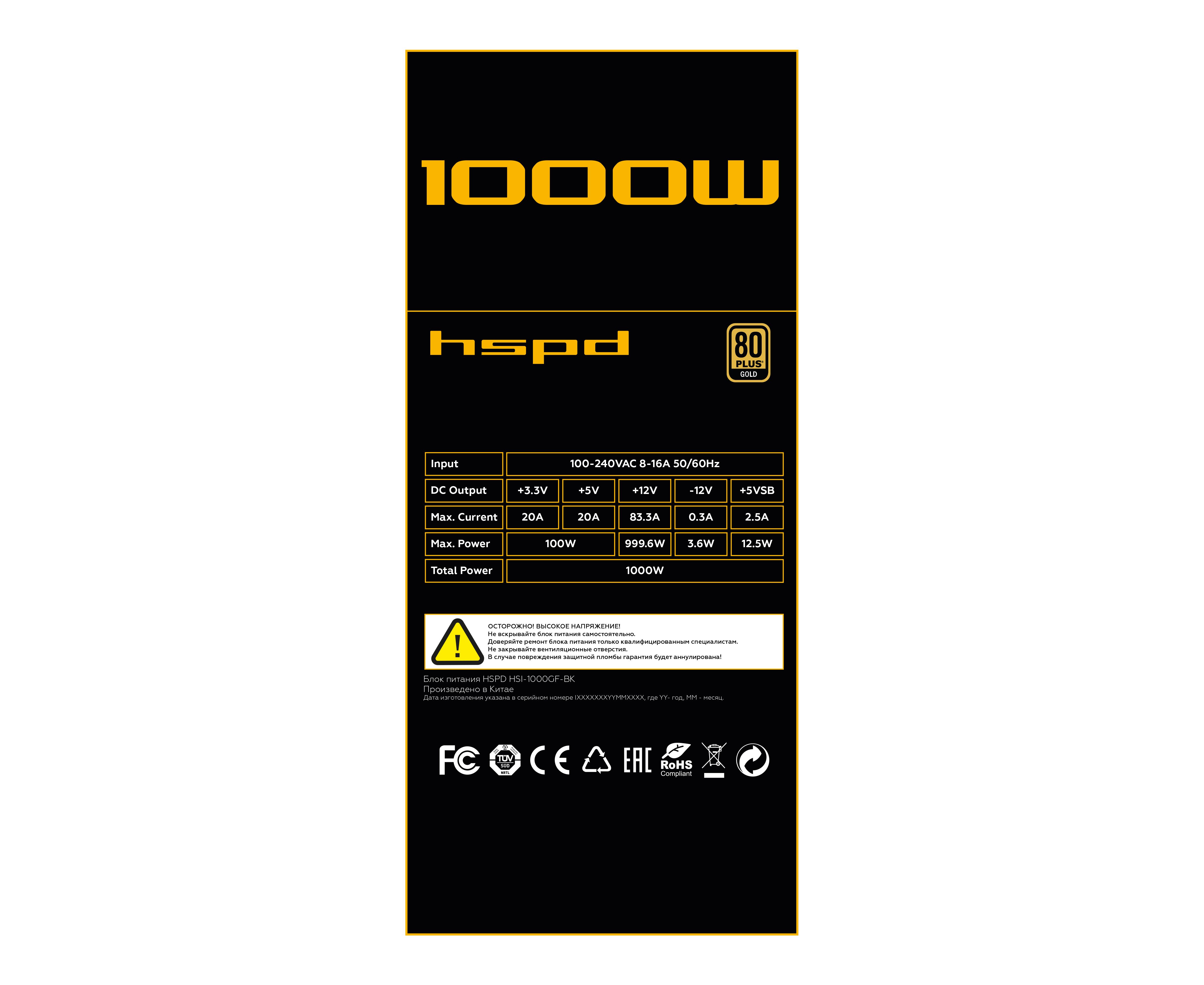 Блок питания HSPD HSI-1000GF-BK 1000W 80+ Gold (ATX, 3.1, PCIe 5.1, Full modular, 1x24(20+4)pin 600mm, 2xCPU 8(4+4)pin 700mm, 2xPCIe*2