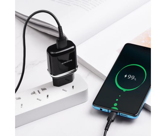 Блок питания сетевой Borofone 1 USB, BA36A, Hight Speed, пластик, QC3.0, цвет: чёрный (1/65/260)