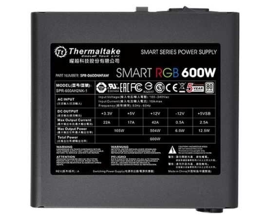 Блок питания Thermaltake PS-SPR-0600NHSAWE-1 ATX 600W Smart RGB 600 80+ (24+4+4pin) APFC 120mm fan color LED 5xSata RTL