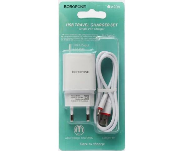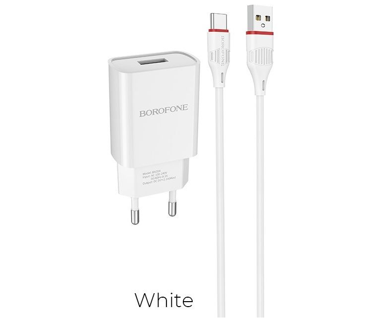 Сетевое зарядное устройство BOROFONE BA20A/ СЗУ + Кабель Type-C 1m/ 1 USB/ Выход: 10.5W/ Белый