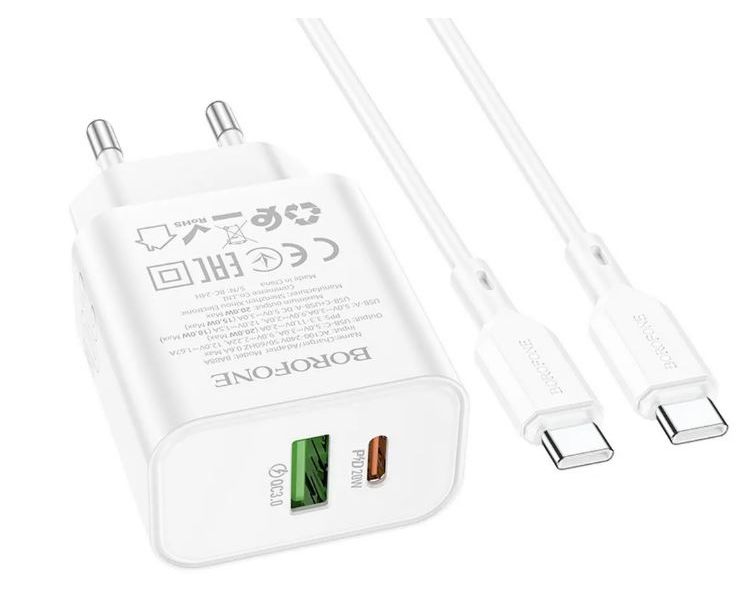 Сетевое зарядное устройство BOROFONE BA88A/ СЗУ + Кабель C-C 1m/PD + QC 3.0/ 2 USB: Type-C + Type-A/ Выход: 20W+18W/ Белый