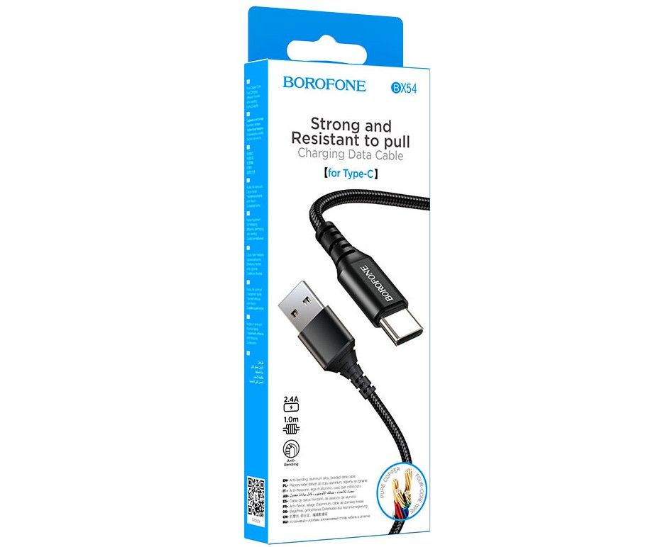 Кабель BOROFONE BX54/ USB Type-C/ 1m/ 2.4A/ Нейлон/ Черный