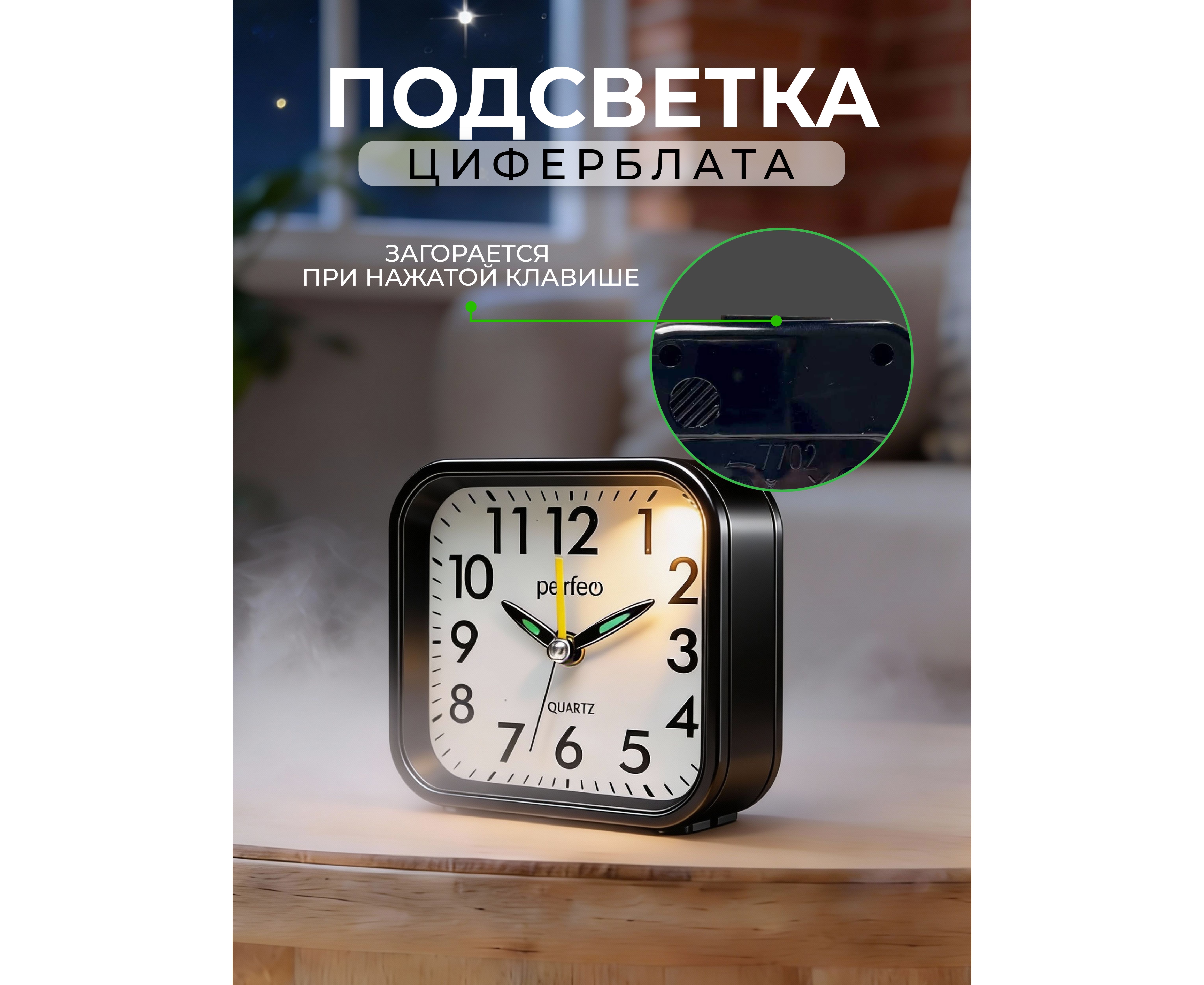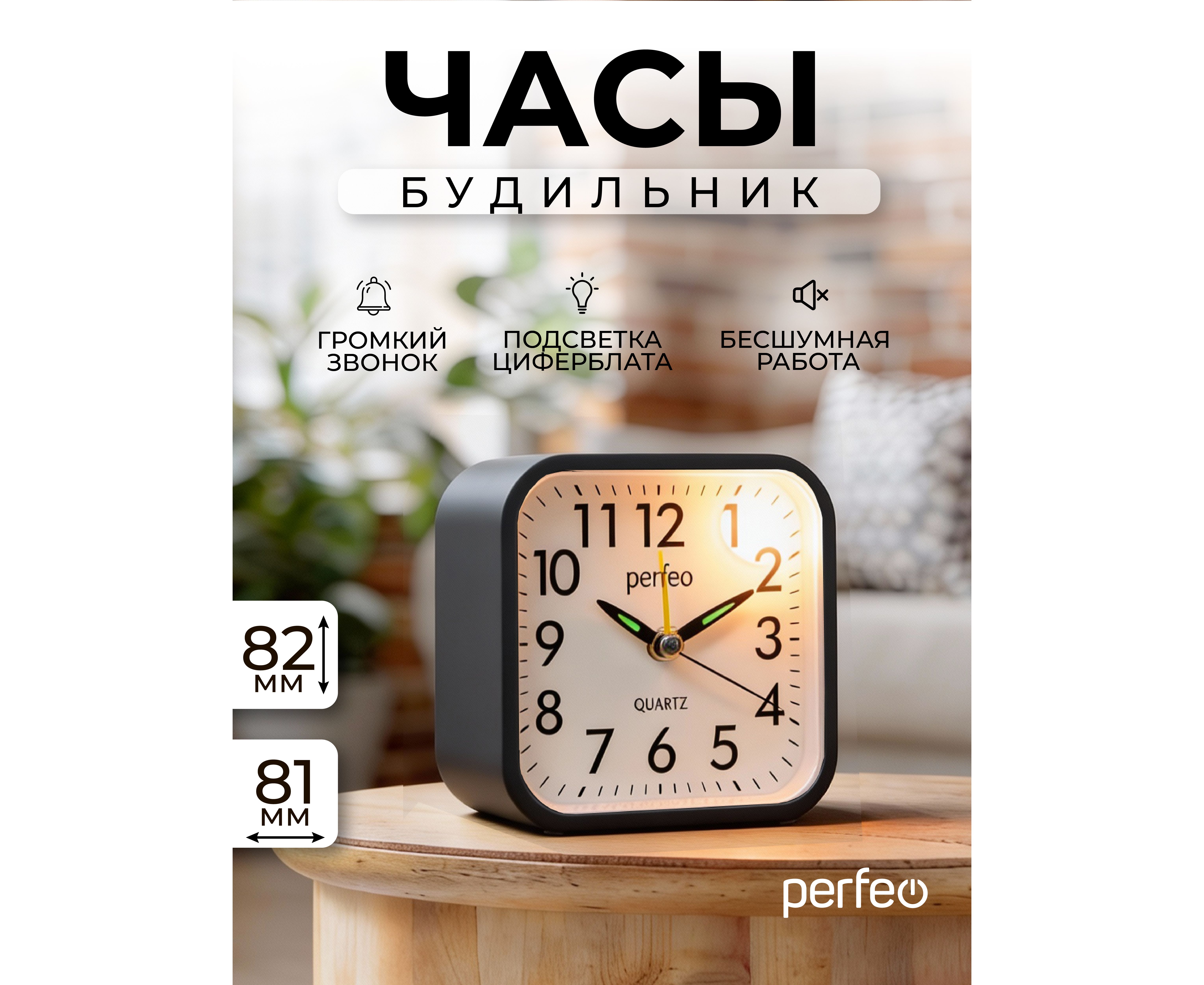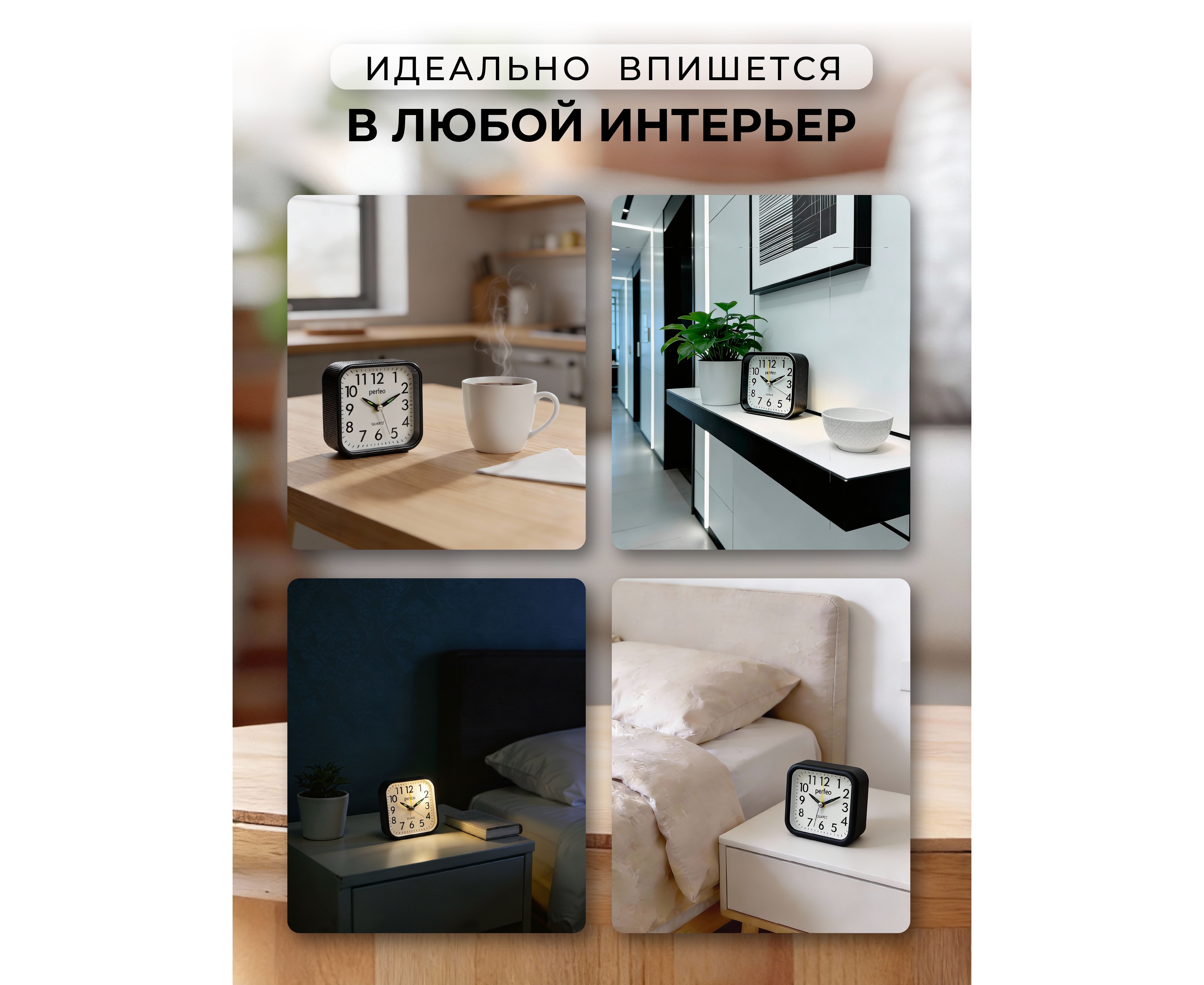 Часы-будильник Perfeo Quartz "PF-TC-028", квадратные с подсветкой, черный, (Арт. PF_C3155)