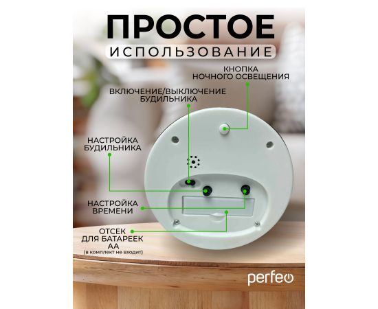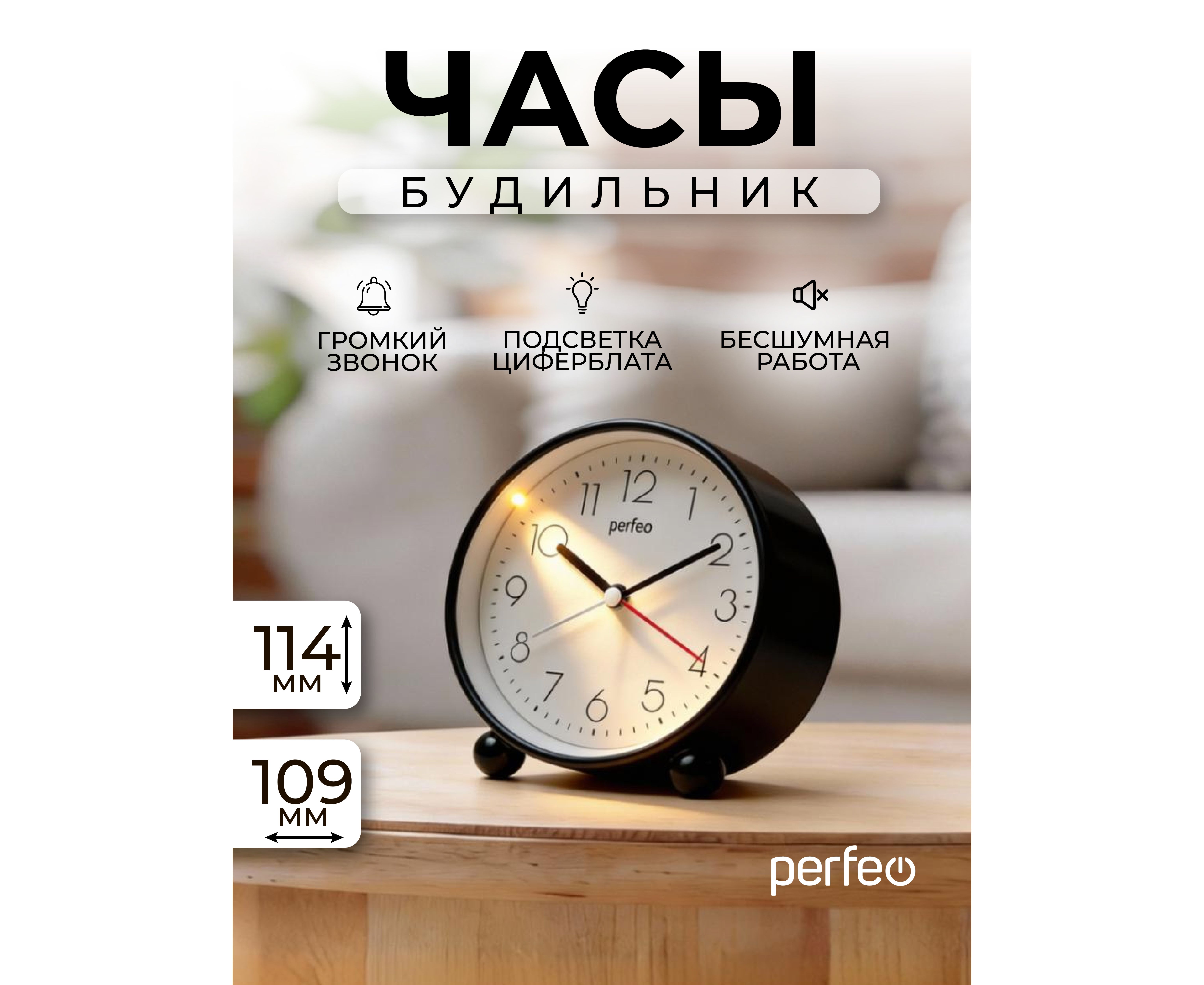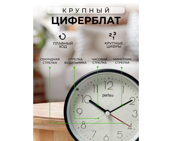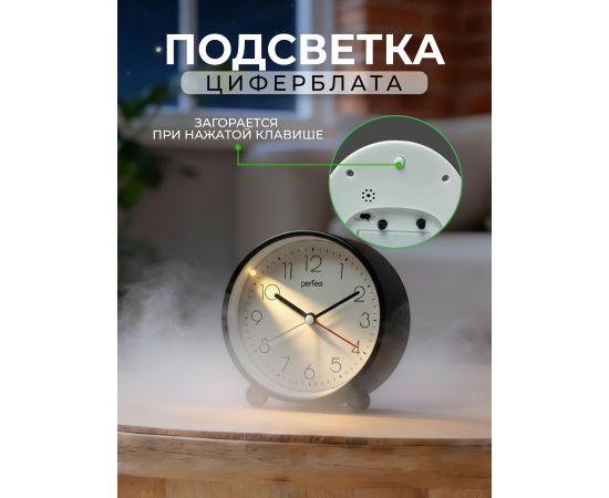 Часы-будильник Perfeo Quartz "PF-TC-030", круглые с подсветкой, черный, (Арт. PF_C3163)