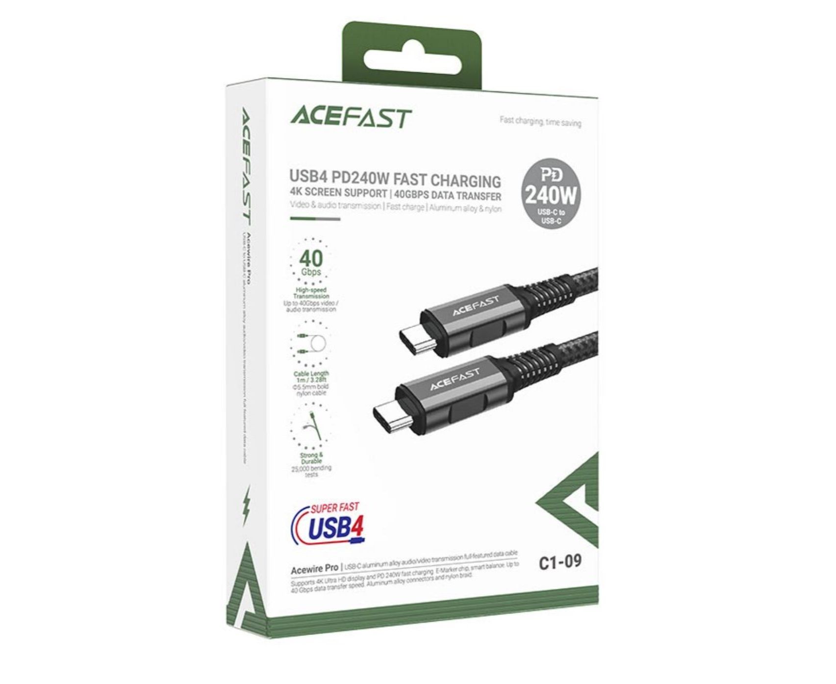 Дата-кабель ACEFAST C1-09 Поддержка передачи аудио/видео (мощность макс 48V/5A) USB-C to USB-C, 1m (черный-серый)