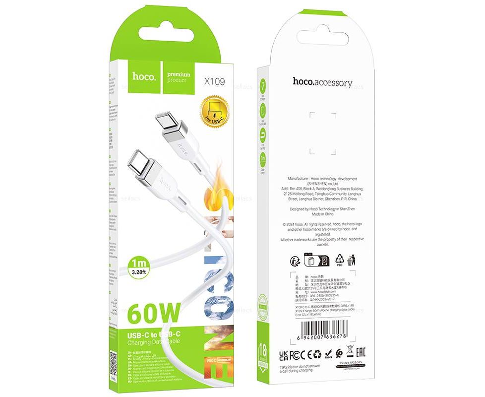 Дата-кабель HOCO X109 Energy 60W silicone charging data cable Type-c to Type-c (L-1M) White