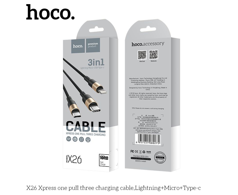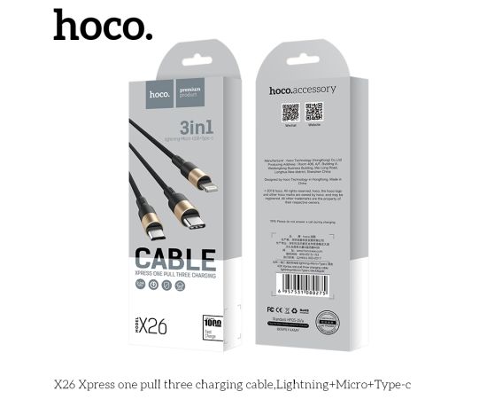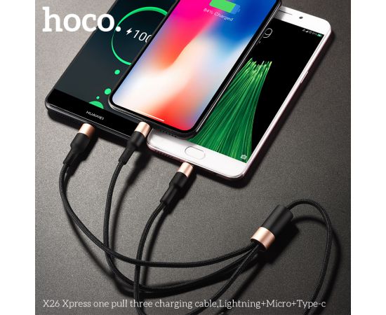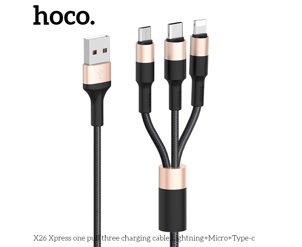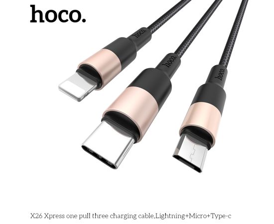 Дата-кабель HOCO X26 Xpress 3-in-1 charging cable iP+Micro+Type-C, 1м, (черный/золотой)