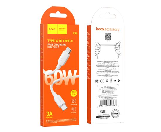 Дата-кабель Hoco X96 предназначен для передачи данных и зарядки устройств с разъемом Type-C. Он обеспечивает быструю зарядку мощностью 60W и передачу данных на высокой скорости. Кабель позволяет подключать смартфоны, планшетные компьютеры, GPS навигаторы с разъемом Type-C к порту Type C на компьютере для синхронизации и зарядки, либо к адаптеру питания Type C. Кабель имеет прочную конструкцию, которая обеспечивает надежную защиту от повреждений и износа. Сила тока 3.0А. Длина кабеля 1 м. Выполнен в двух цветах.