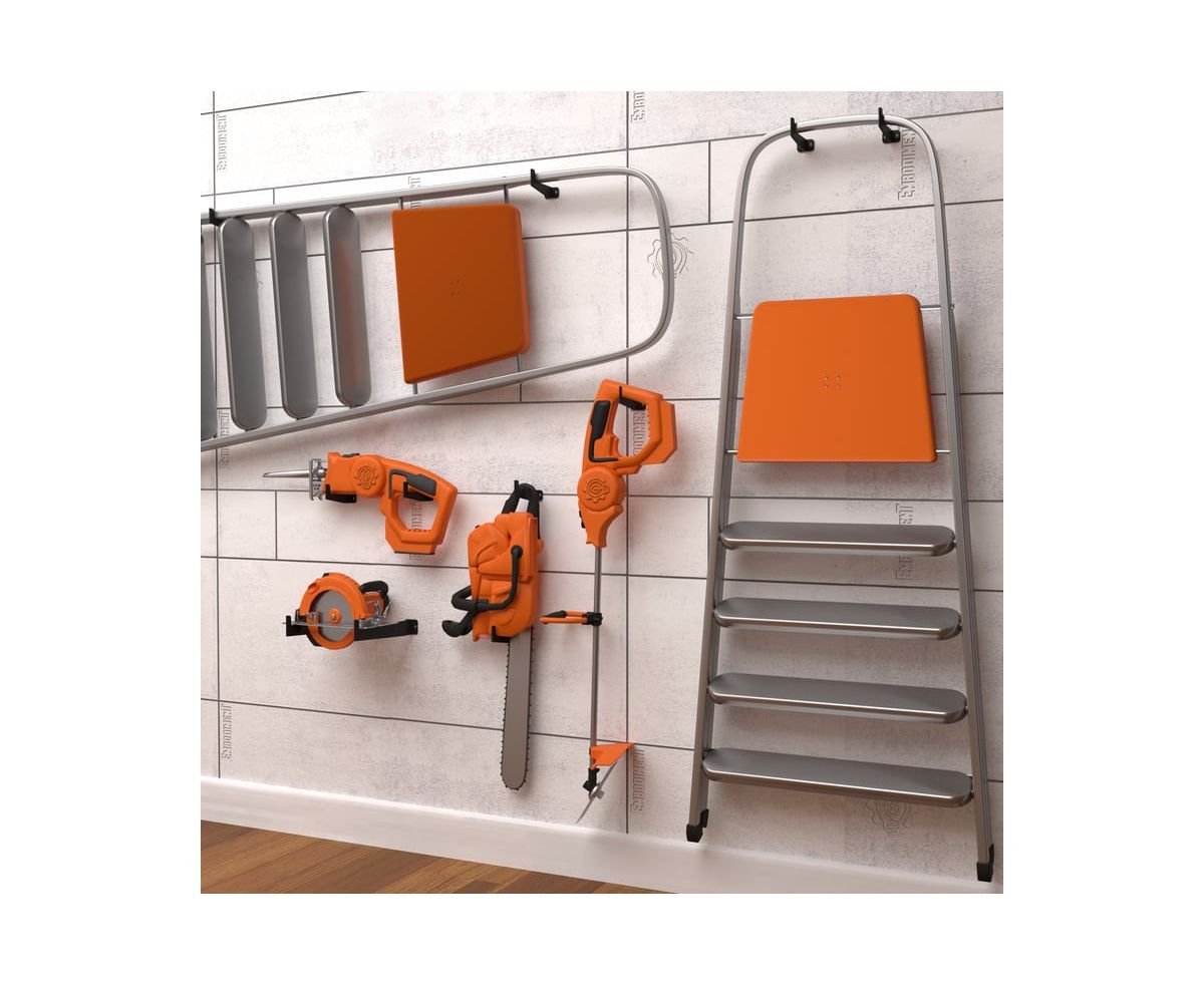 Совместное использование предлагаемых позиций позволит зафиксировать необходимый предмет, который не превышает заявленную нагрузку, такие как: Электроинструмент: Сабельная пила; Триммер аккумуляторный; Газонокосилка; Цепная пила; Дисковая пила; Циркулярная пила Бытовые предметы: Светильники; Цветы с кашпо; Лыжи Лестницы и стремянки; лопаты, грабли, косы, мотыги, садовые вилы, а так же веревки и садовые лейки и другие изделия.