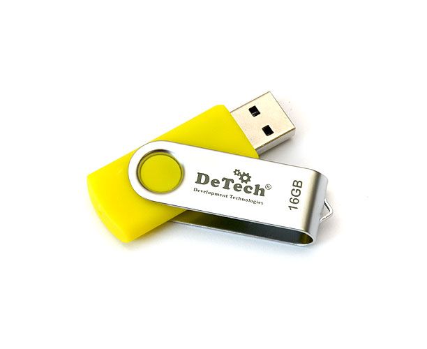 Корпус DeTech изготовлен из прочного пластика. Благодаря богатой цветовой гамме каждая модель приобретает индивидуальный характер. Дополнительным преимуществом является поворотная металлическая скоба, которая также защищает устройство памяти USB и придает ему неповторимый вид. Поворотная система замыкания USB и отсутствие колпачка удовлетворит потребности даже самых рассеянных пользователей.