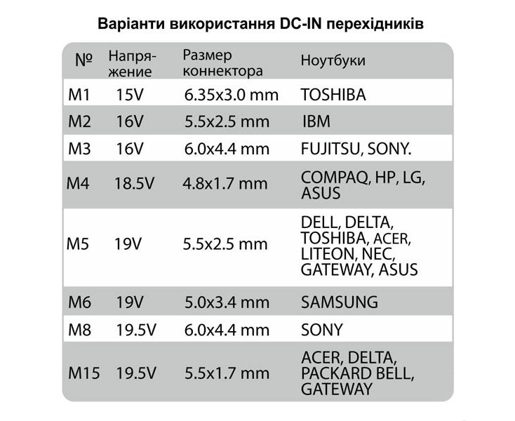 Совместимость коннекторов с ноутбуками: Asus, Sony, Samsung, Acer, Dell, Lenovo, IBM, HP, Nec, Fujitsu.