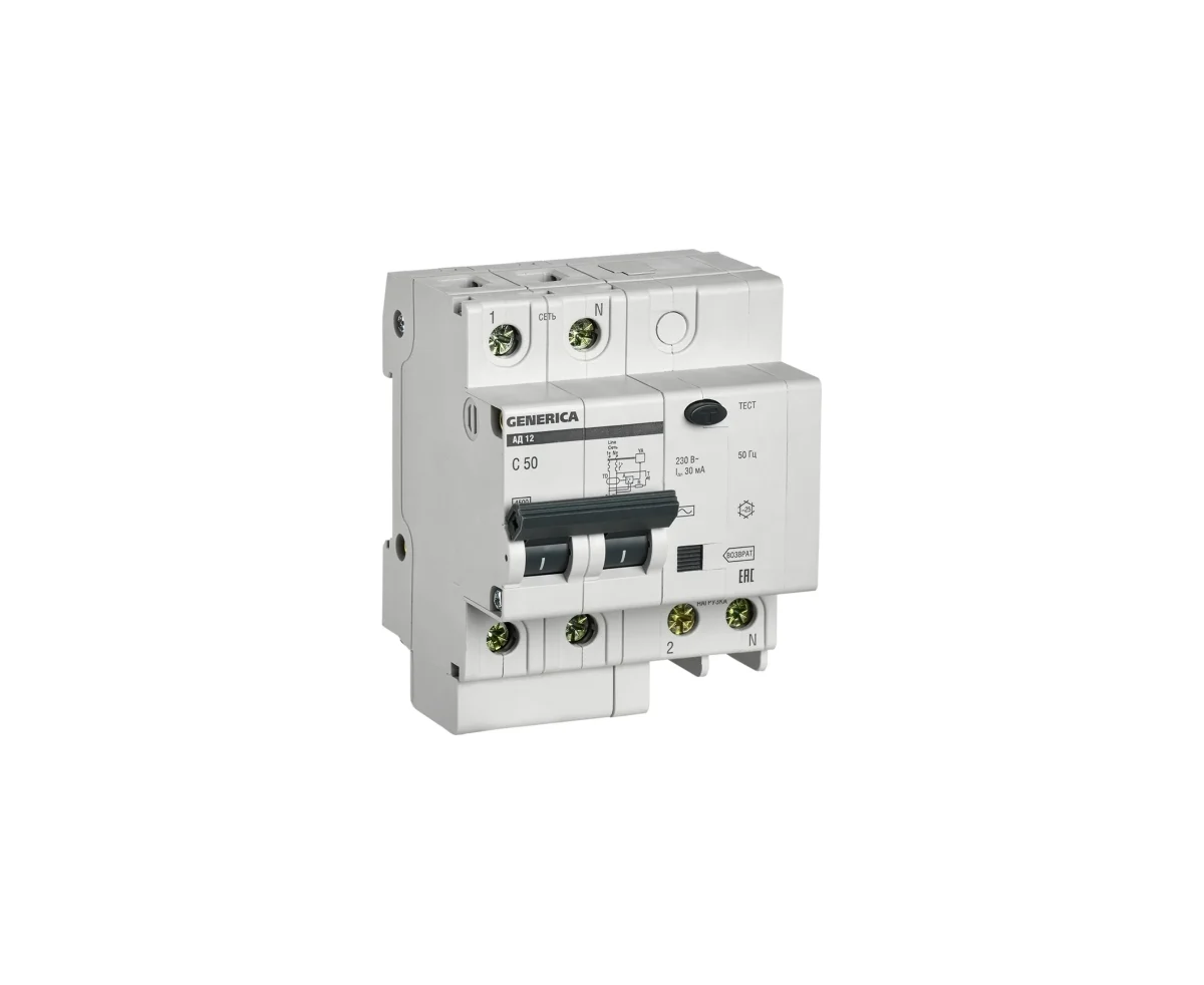 Дифавтомат IEK АД12 Generica (MAD15-2-050-C-030) 50A тип C 4.5kA 30мА AC 2П 230В 4мод серый (упак.:1шт)